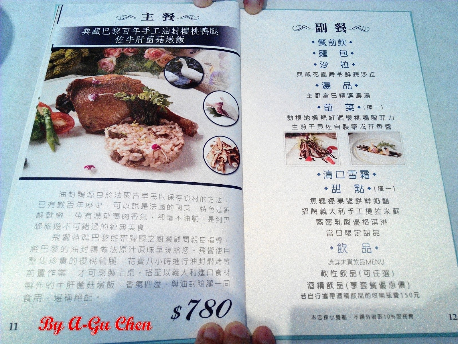 法國料理內容更為豐富,包含一份主餐、餐前飲、麵包、沙拉、湯品、前菜(二選一)、清口雪霜、甜點(四選一)及軟性飲品任選(酒精飲品享套餐優惠價)。