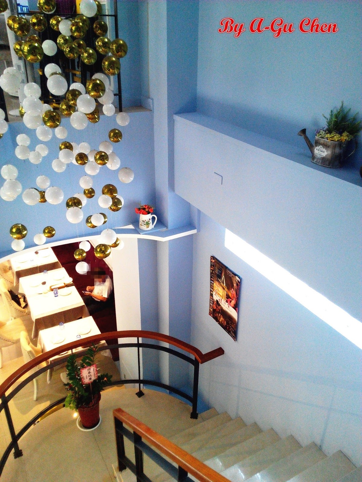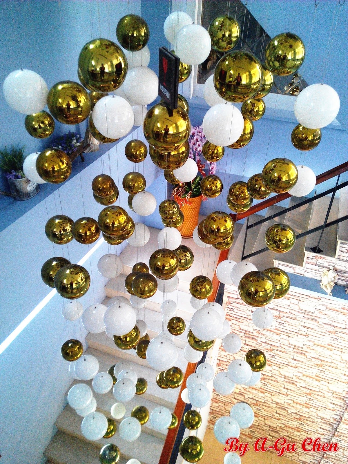 通往二樓的樓梯為類似迴轉梯的設計,並有著一大串白色、金黃色球體的吊掛裝飾,不少客人會於此處拍照留念,相信晚上更別有一番美感。