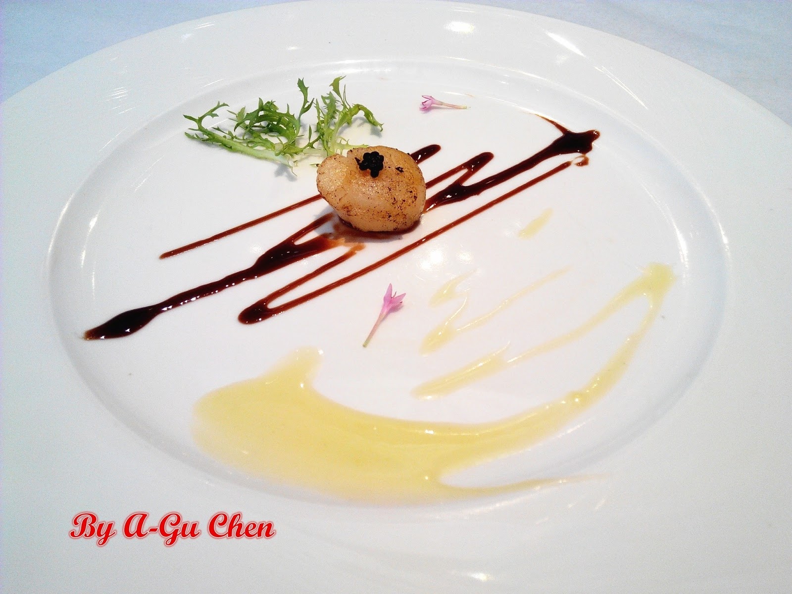 【前菜(生煎干貝佐自製第戎芥香醬)↓】