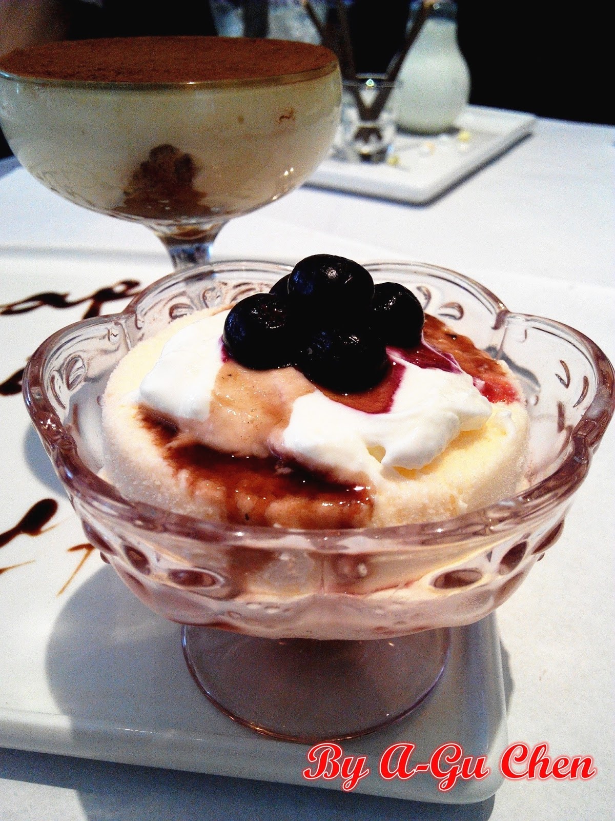 【甜點:藍莓乳酸優格淇淋(右)、招牌義大利手工提拉米蘇(左)↓】