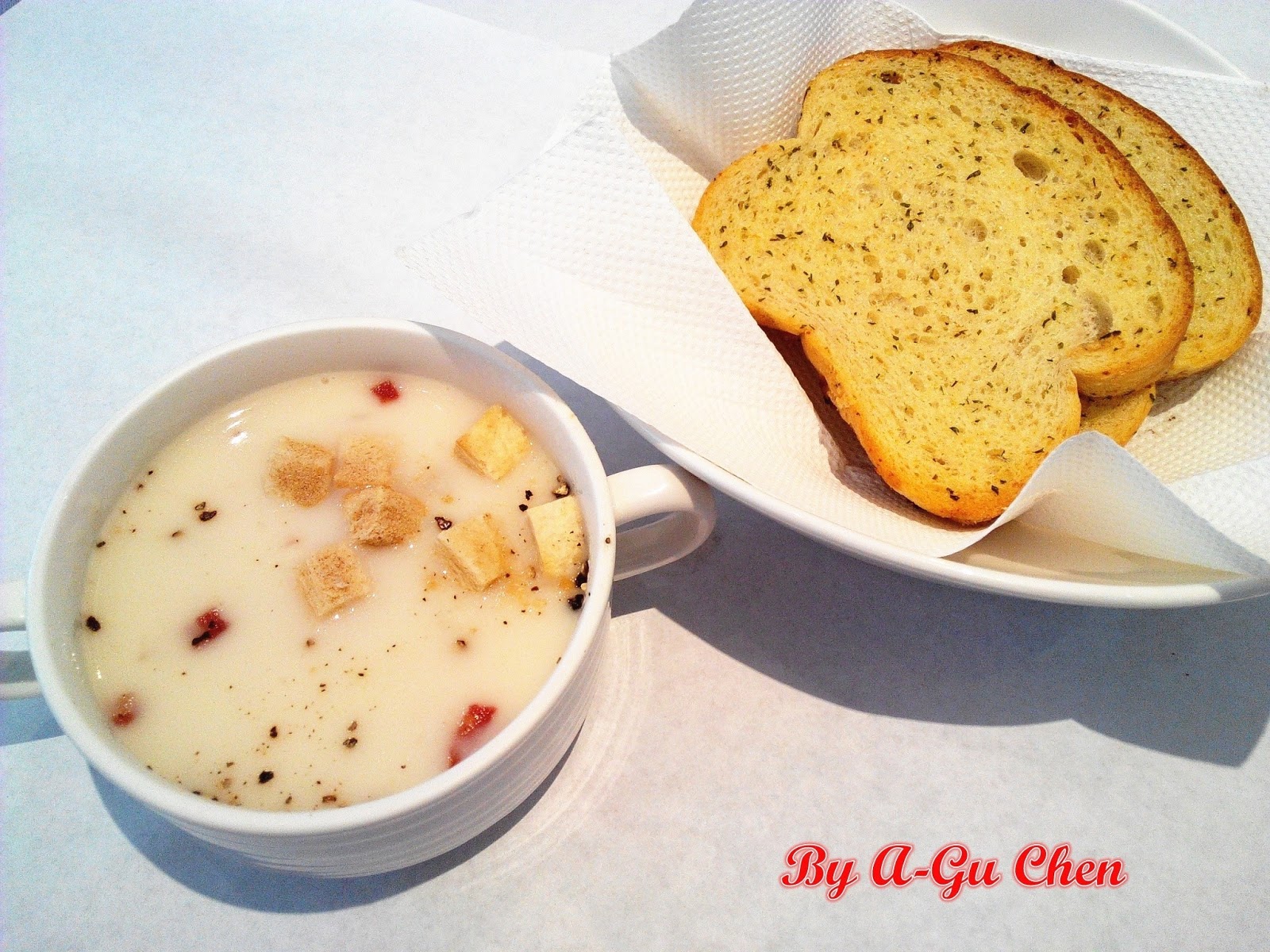 【麵包(法式香蒜奶油麵包)、主廚當日精選濃湯(馬鈴薯培根濃湯)↓】