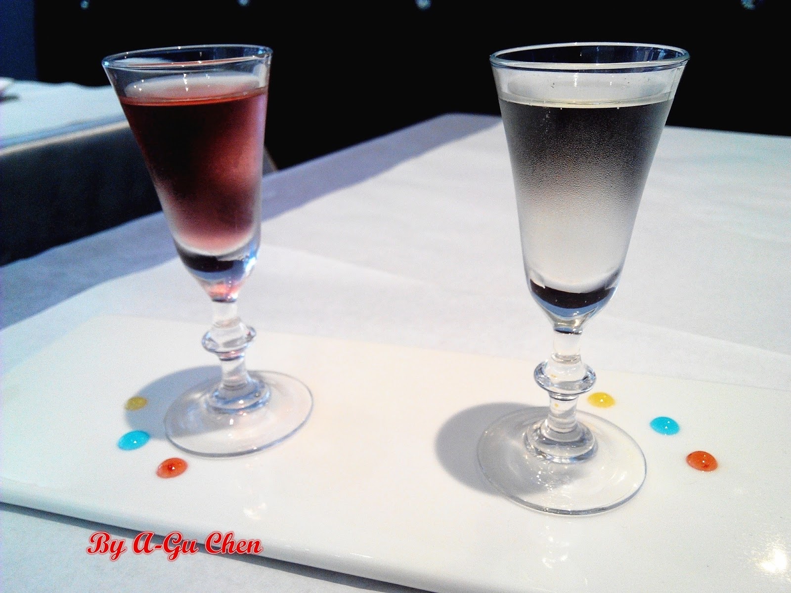 這兩杯餐前酒分別是法國進口水蜜桃酒(右)與西班牙進口粉紅酒(左)。