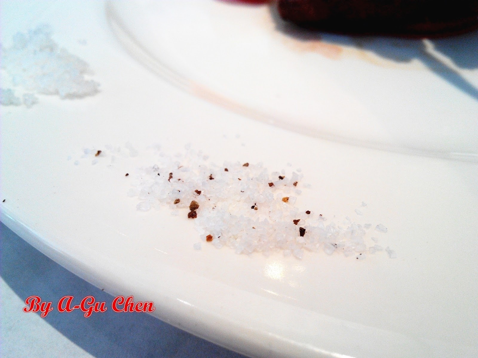 鹽之花,重量較一般常見的鹽巴來得輕,其呈現的結晶狀也很特別。直接試吃了一些,口感較鹽巴更細緻。以牛肉微沾食用,其鹹而不苦的風味滿能牽引出牛肉的鮮甜味,最佳配角非鹽之花莫屬。