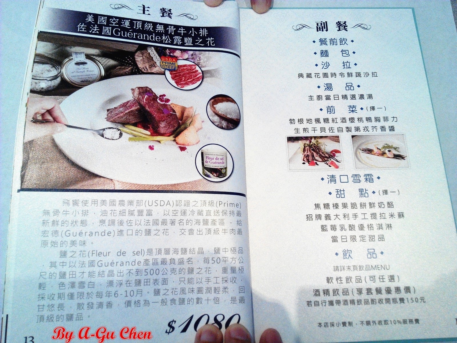 無骨牛小排使用的是由美國空運來臺的頂級牛小排,而餐點名稱中的松露鹽之花,則產自法國著名的海鹽產區,據服務人員說這鹽之花是海鹽頂層的結晶,產量其實不多,且因只能手工採收,加上採收期又只有六到十月,是相當得來不易的高檔食材。Guérande(給宏德)即是著名產區之一,其地位相當於臺灣的七股。