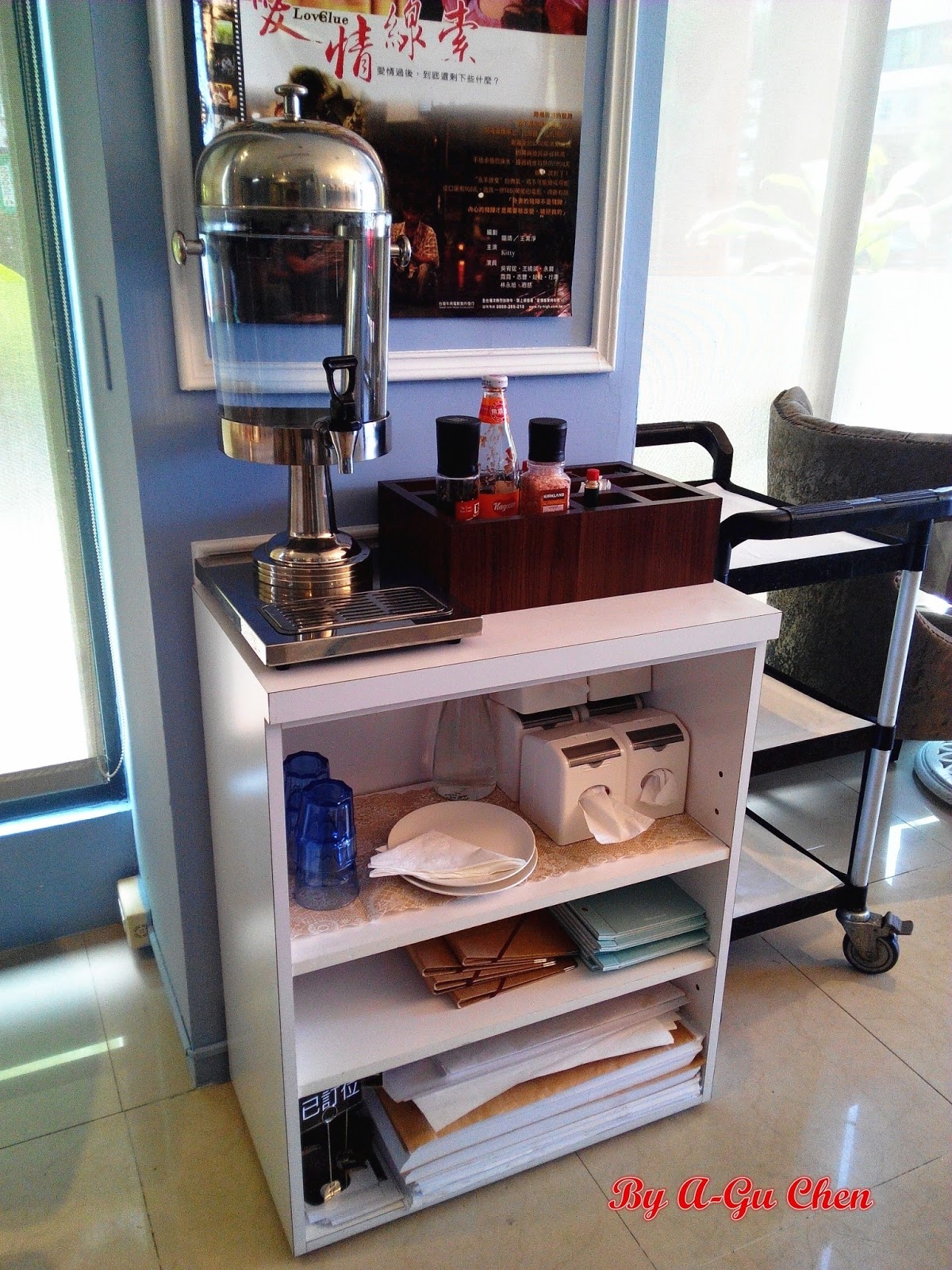 自助區提供檸檬水、調味料與各類用品。
