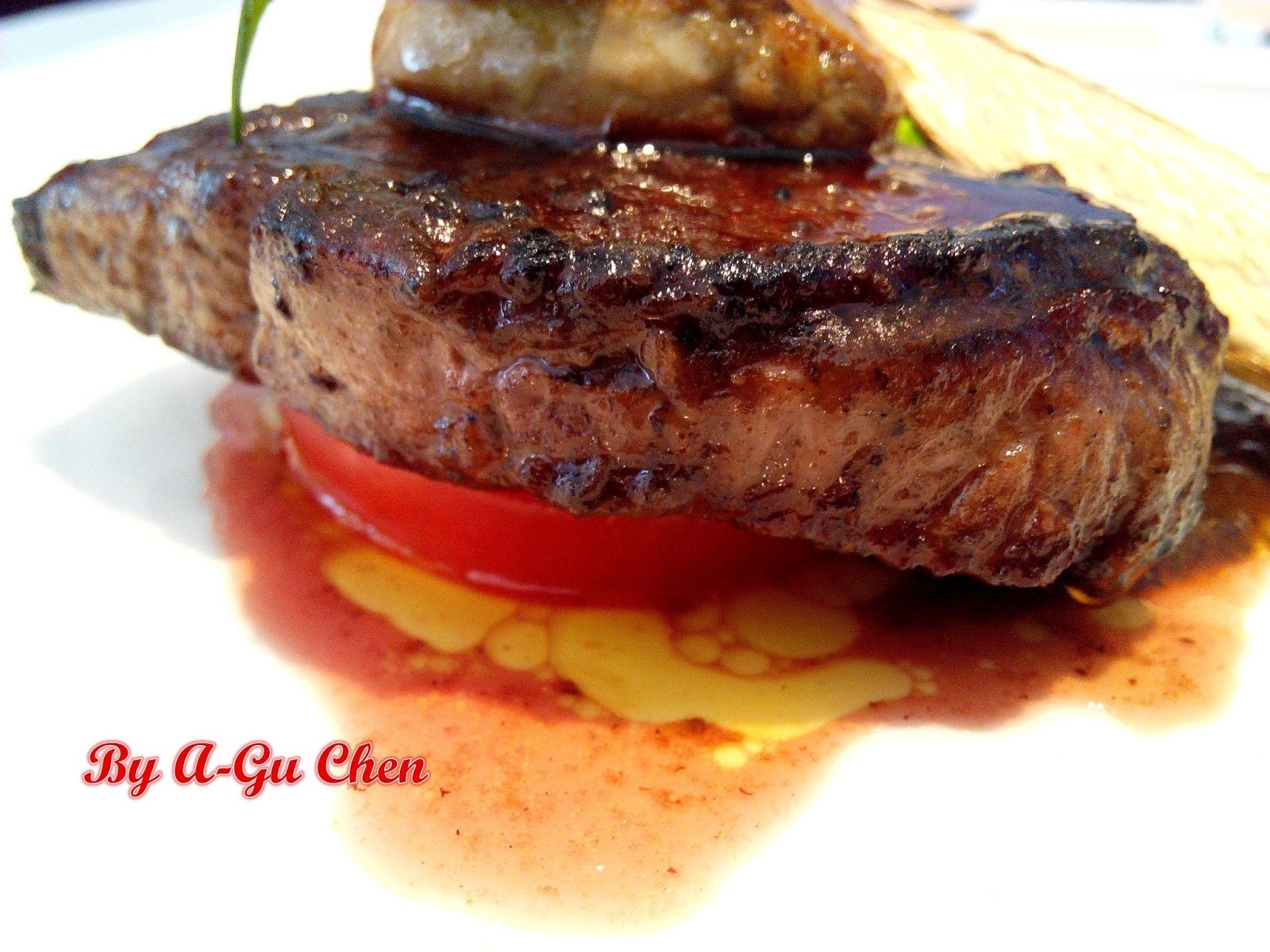 表面烤得微焦,散發著一股炙烤的香氣,裡頭透著粉紅色的肉質紮實卻軟嫩細緻,油花雖不多,但咀嚼時滿溢的肉汁帶來了甘甜鮮美的滋味,加上那特別調製的紅酒牛肉醬汁,滋味非常濃郁卻不影響牛肉本身風味。