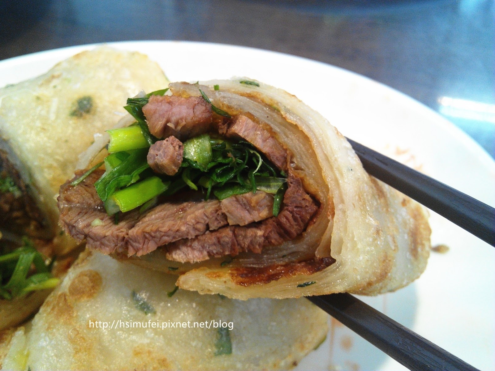 類似烙餅的餅皮煎得酥香微脆,越嚼越香。裡頭裹著頗有厚度的帶筋牛肉片與青蔥,並佐以甜麵醬增加風味,吃起來十分爽口。