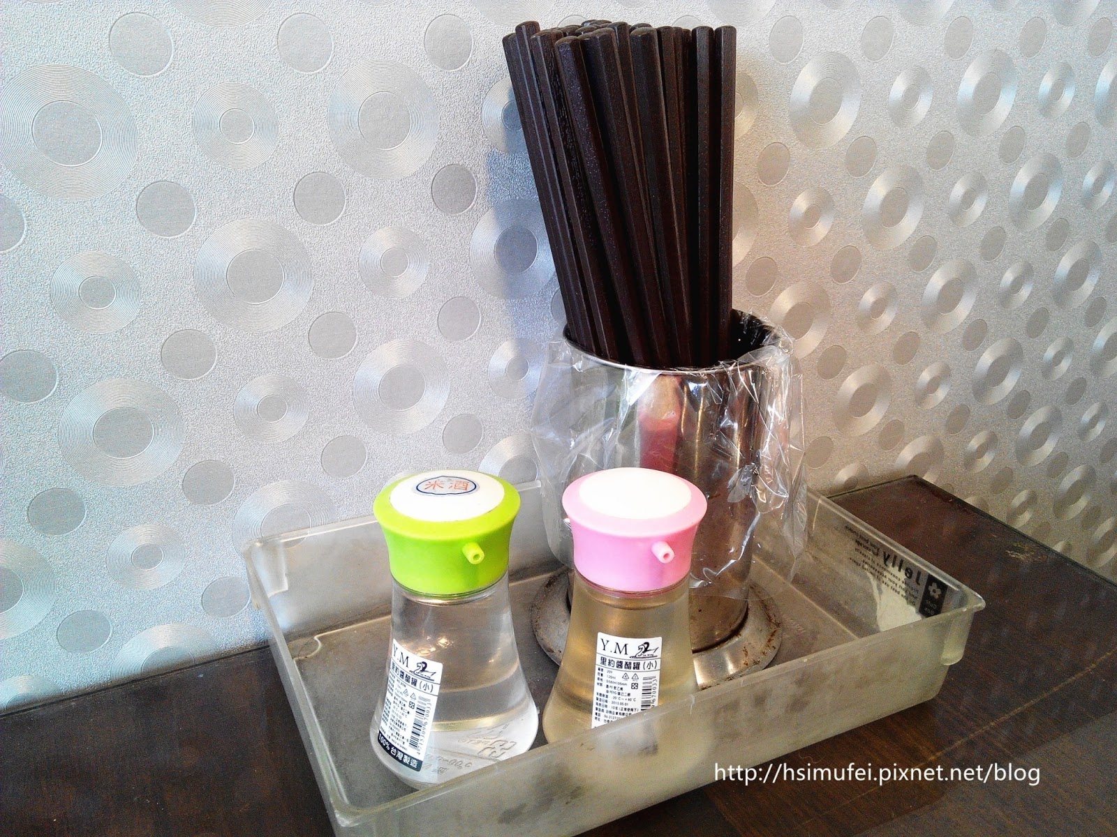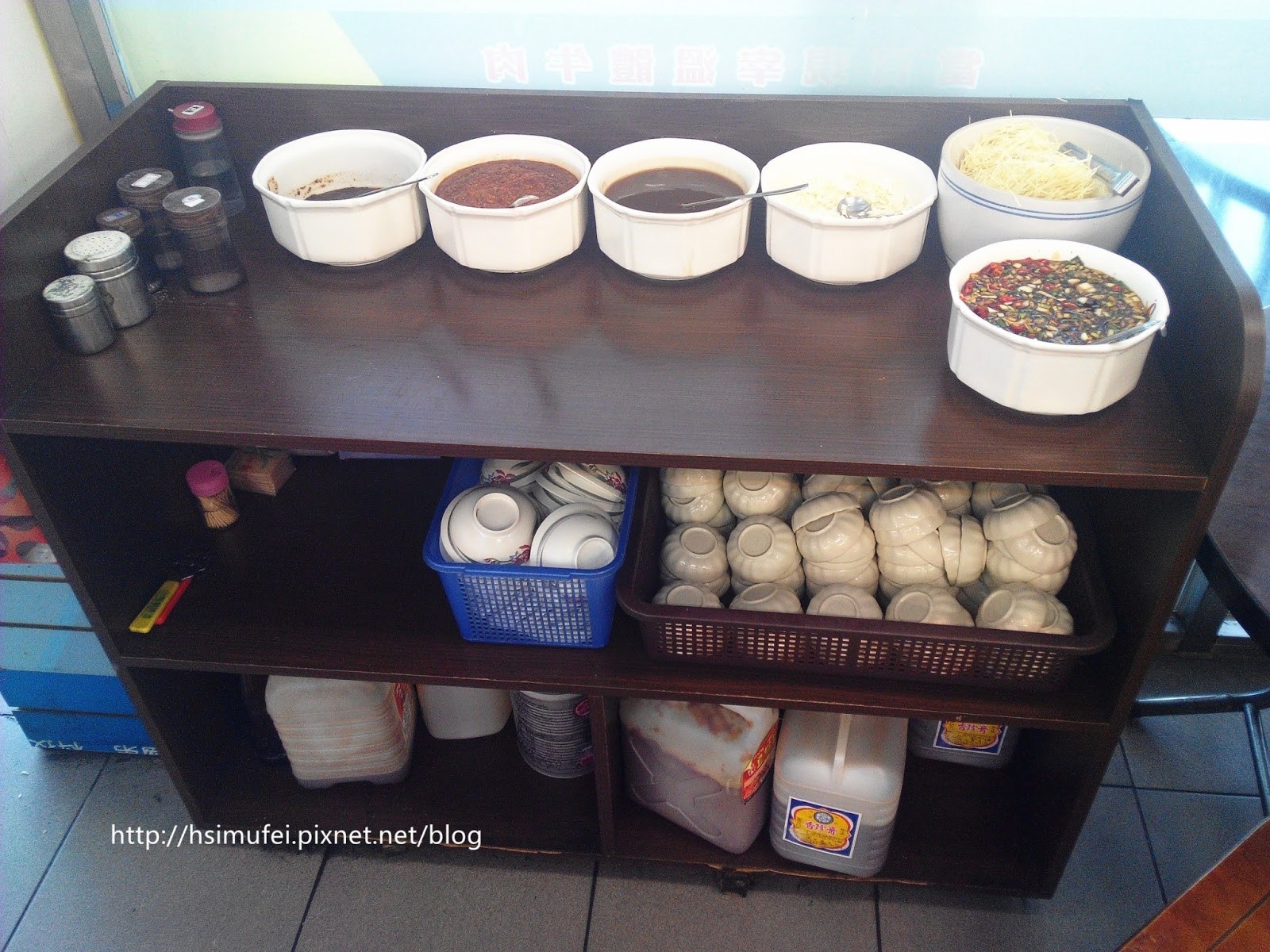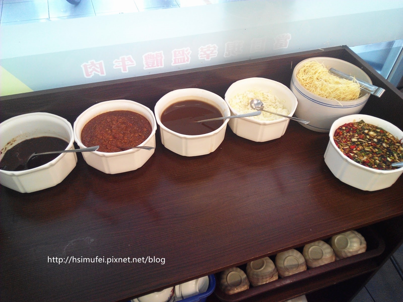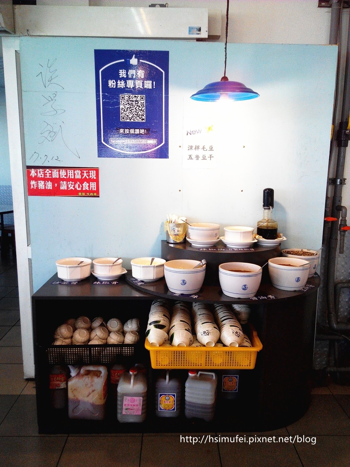 店家自助區有三處,室內兩處,騎樓一處。提供碗碟與各式醬料。