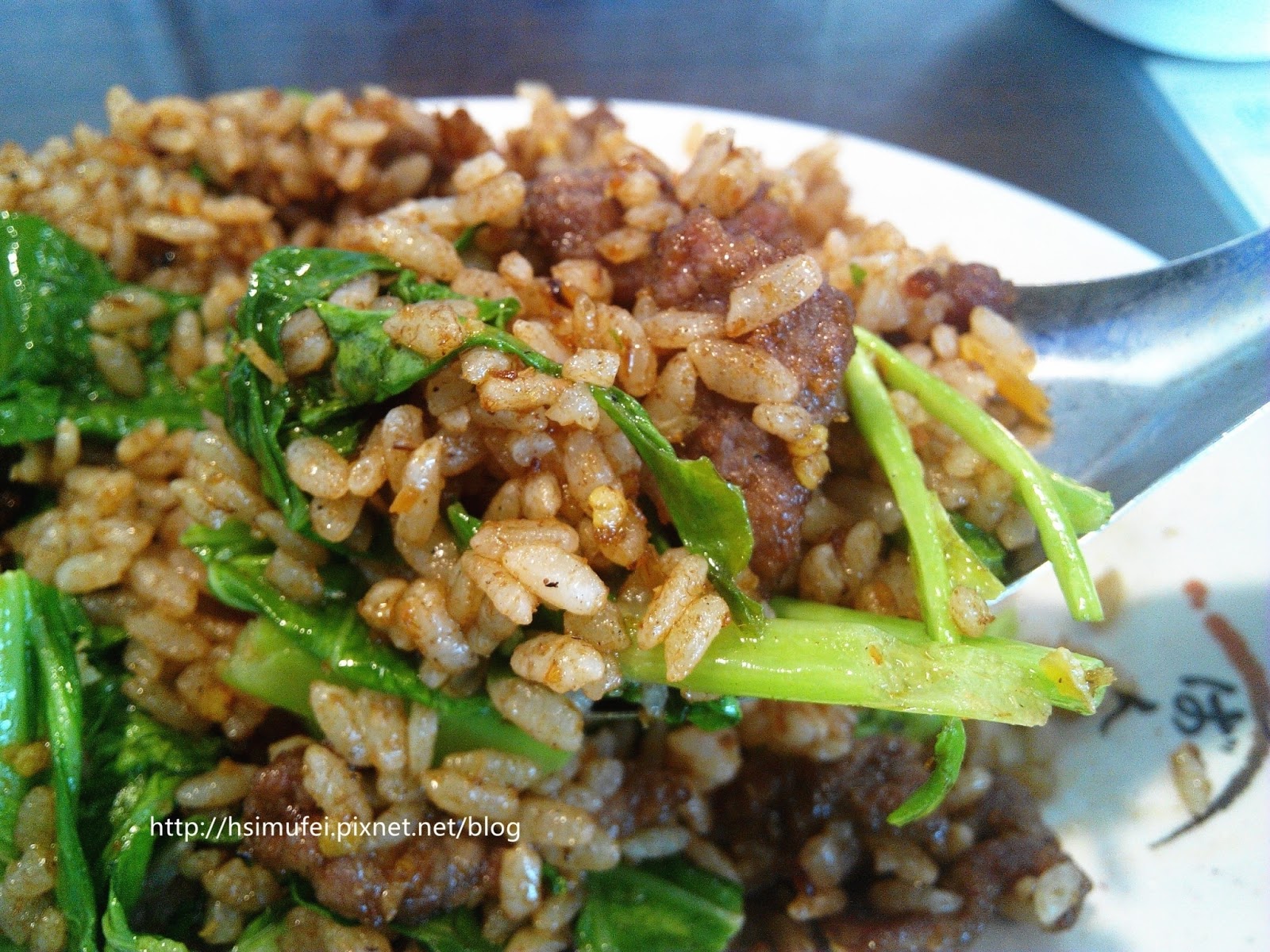 以分量不少的牛肉與甘藍菜,加上沙茶醬炒成的牛肉炒飯,米飯的顆粒感明顯,沙茶香氣濃郁,牛肉熟度恰好。