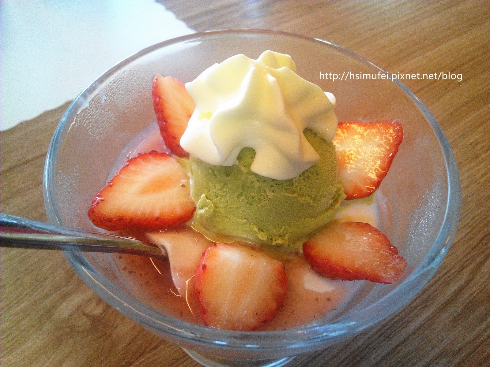 當天的甜點為鮮草莓抹茶冰淇淋奶酪,看起來猛猛der ,就這價位套餐的甜點來說實屬相當豪華。由上到下依序是鮮奶油、抹茶冰淇淋、草莓與鮮奶酪。最吸睛的非草莓莫屬囉!