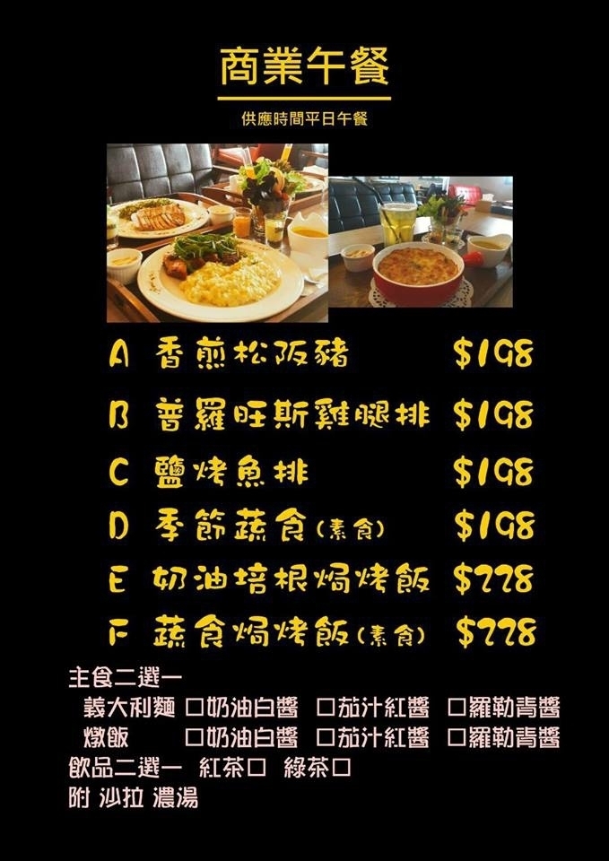 每人低消為180 元,點用義大利麵、燉飯、起司焗烤飯者除了若干品項外,大多可任選醬汁,並會附上開胃沙拉、湯品、甜點及100 元飲品,若想換購其他飲品需補差價。