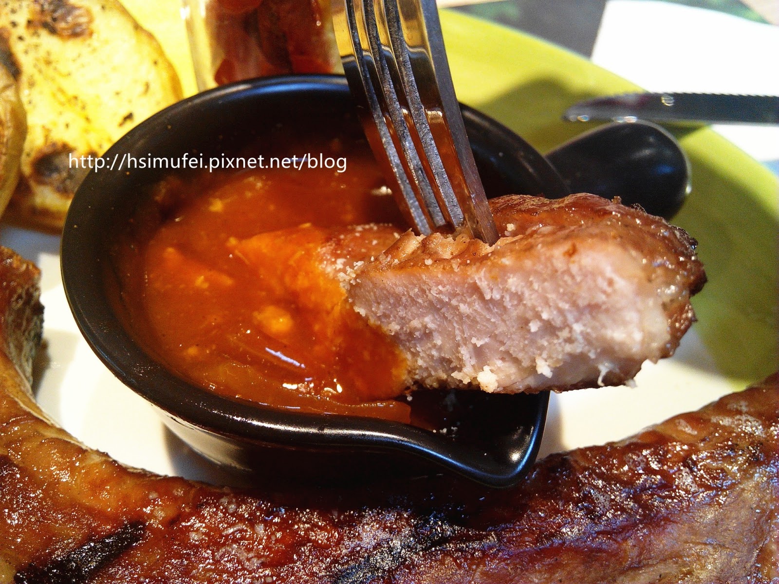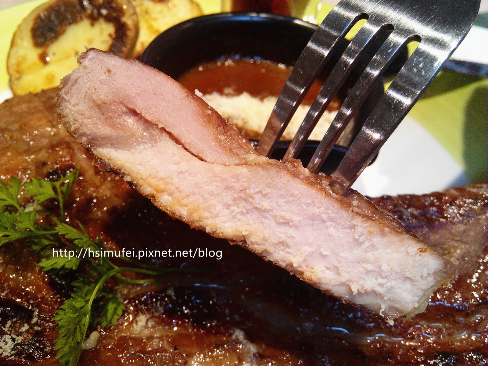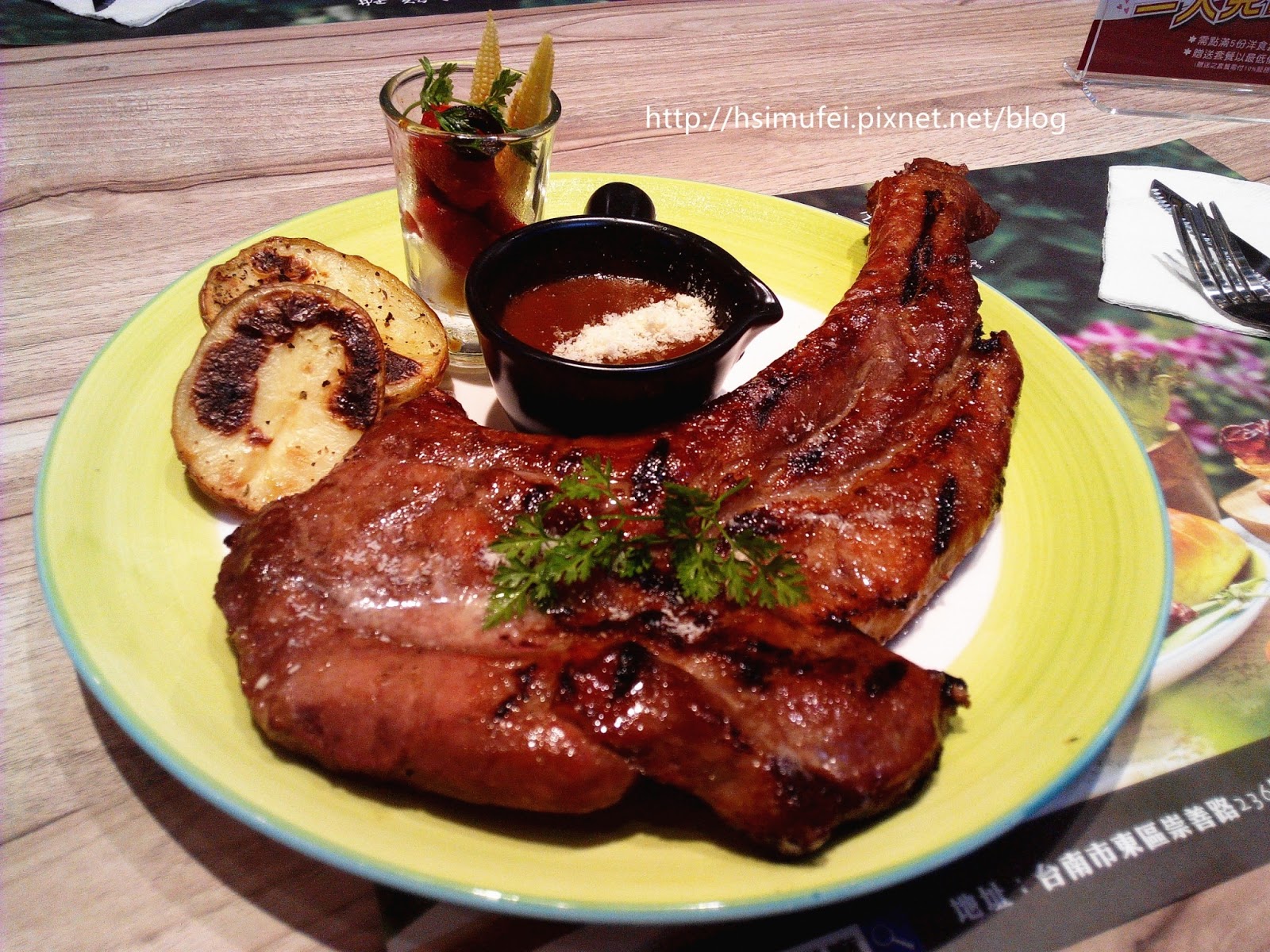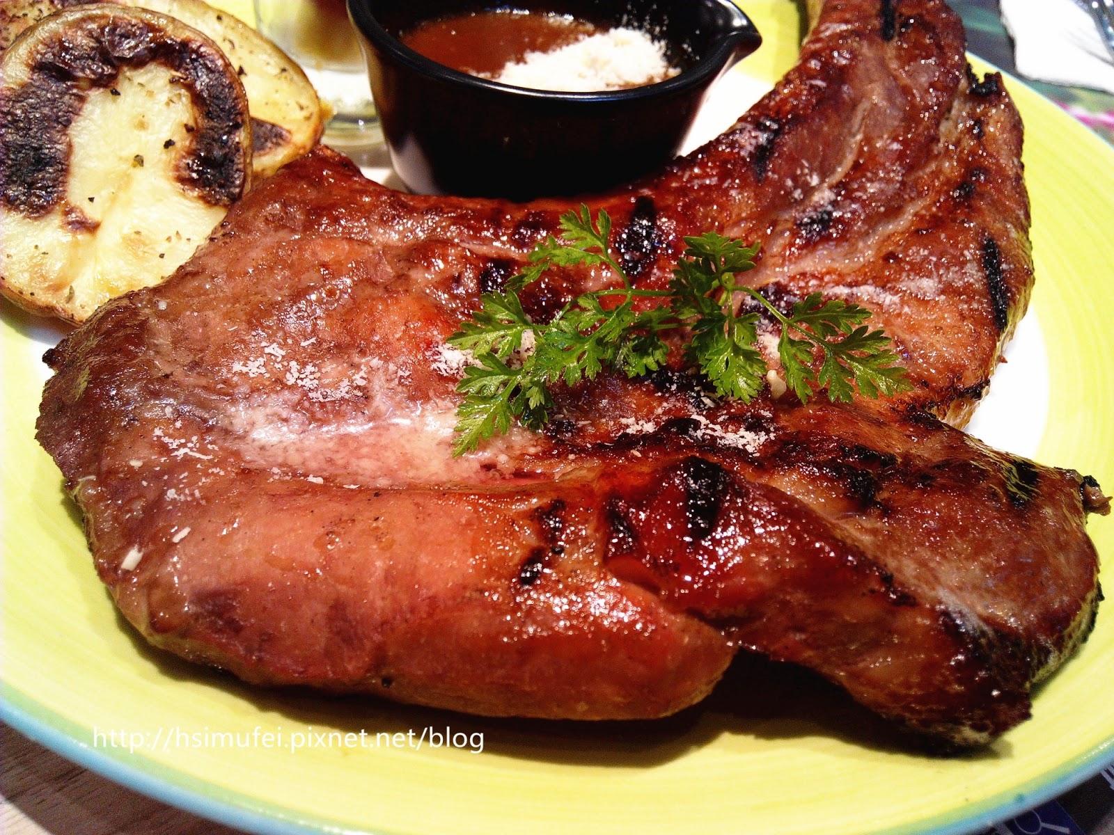 戰斧豬排那烤得紅暾暾而帶點微焦的表面正漫著誘人的油光。