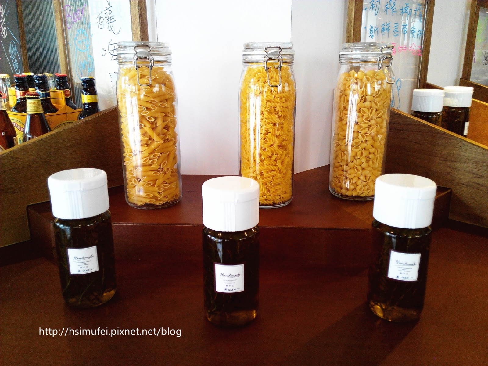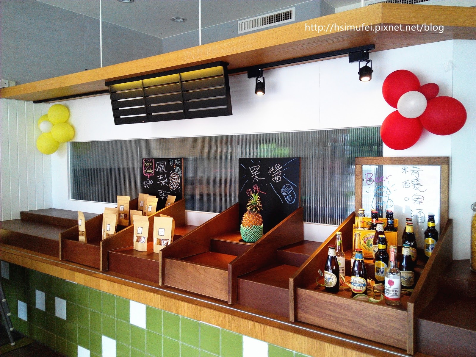 櫃檯旁展有果乾、果醬、啤酒、食用油品等商品供顧客選購。