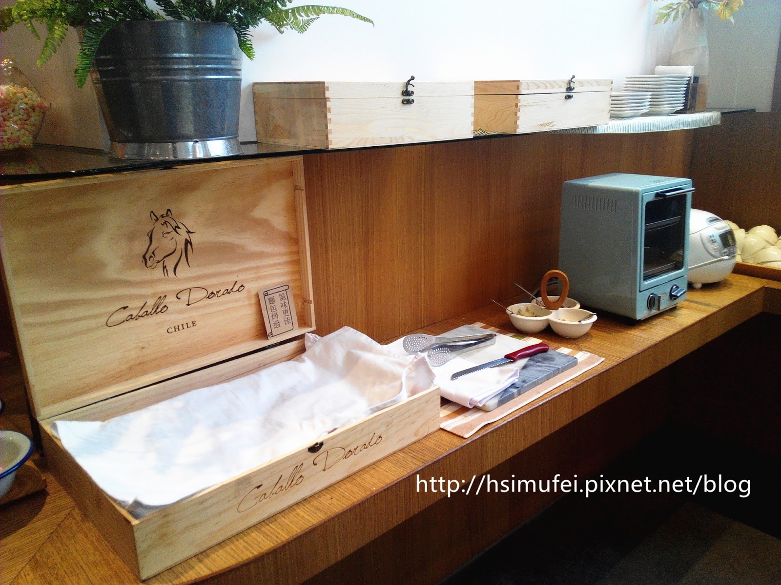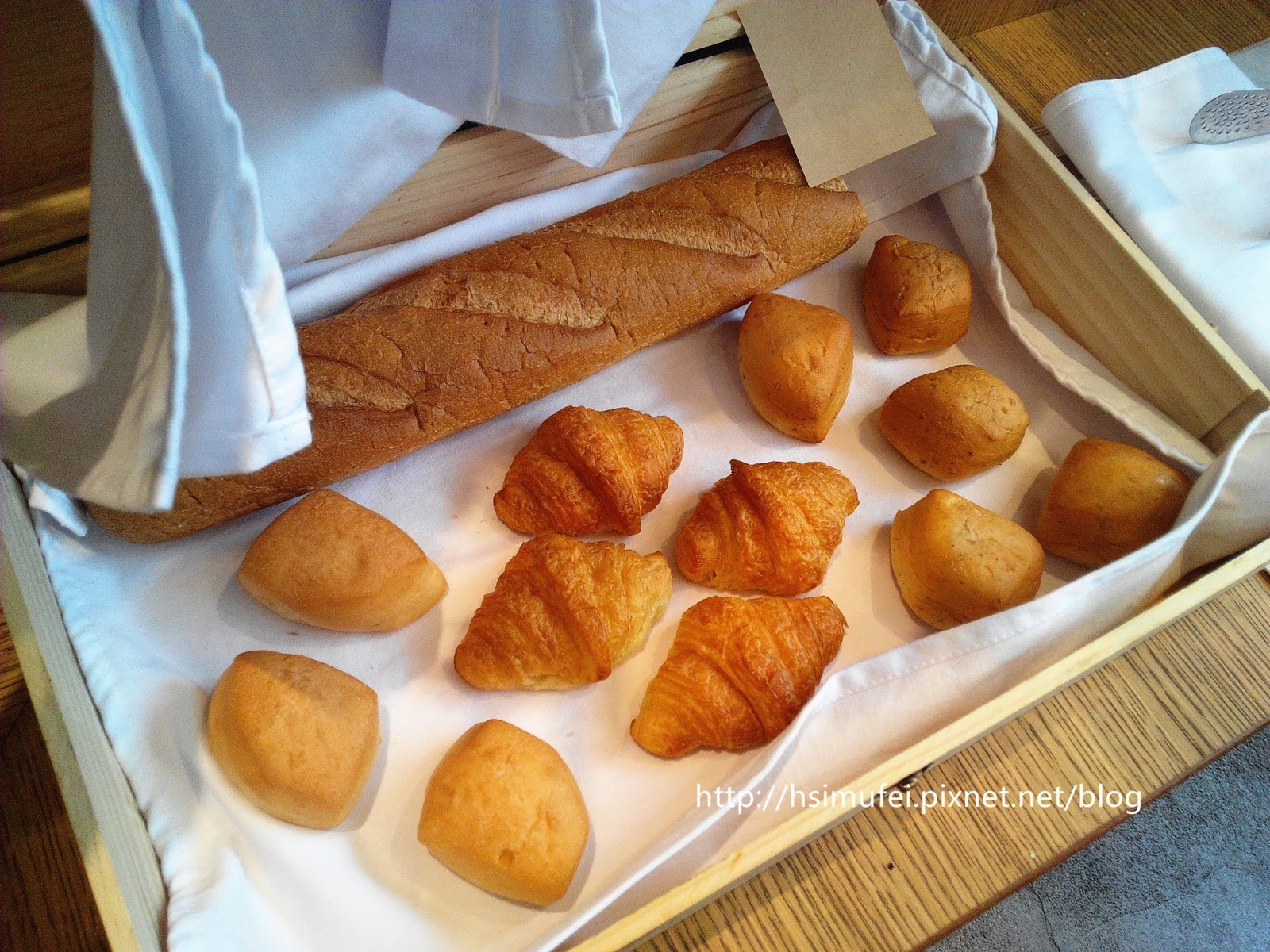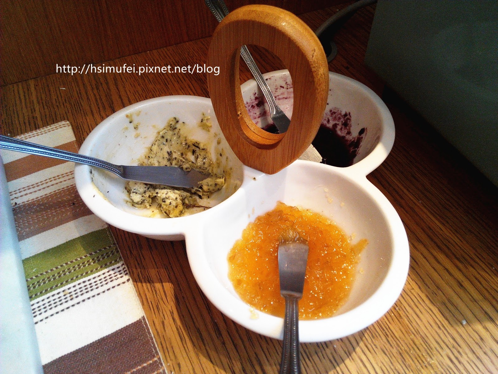旁邊木檯上供應四種麵包,可放入烤箱自行烘烤,並備有蒜香醬與兩種果醬,可塗在麵包上增添風味。