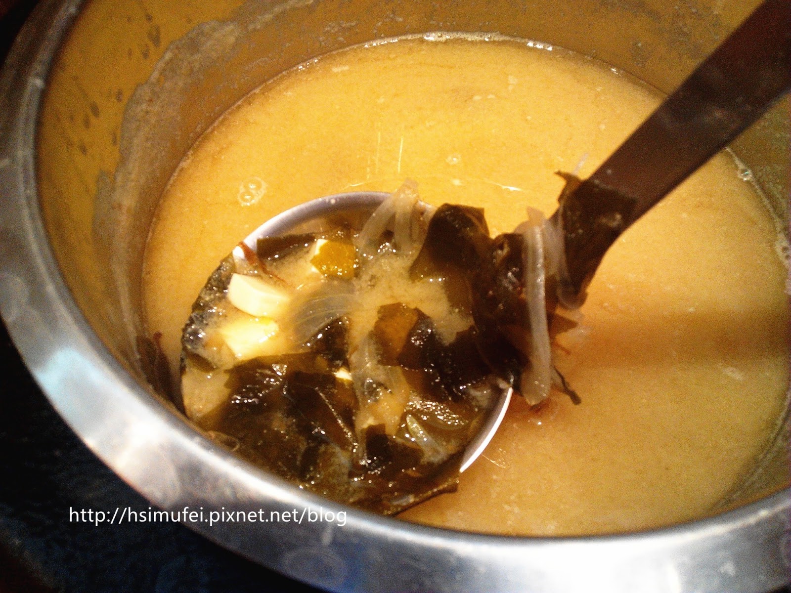 味噌湯裡有著滿滿的嫩豆腐、洋蔥、柴魚與紫菜。