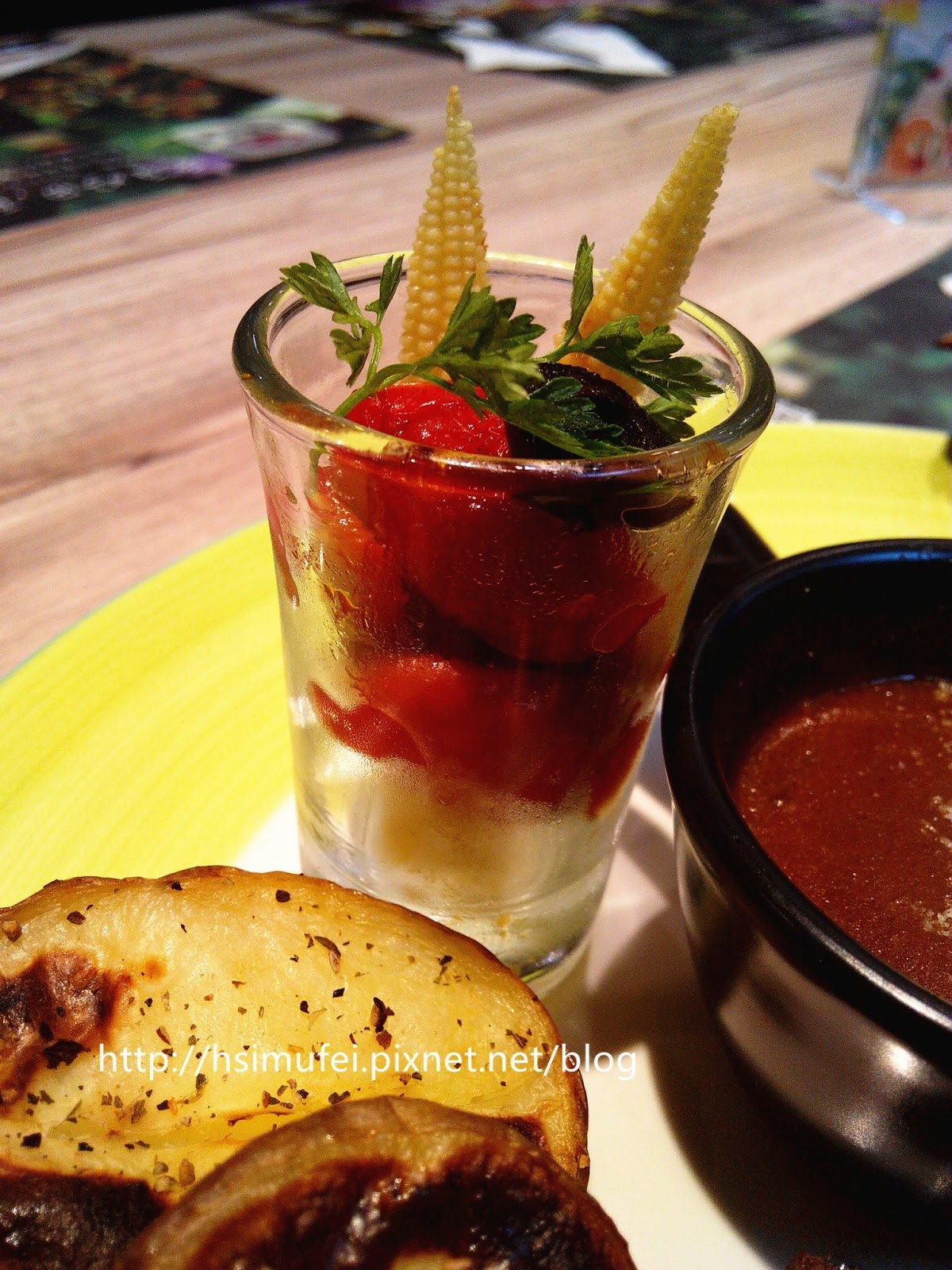 杯裝沙拉裡有玉米筍、黑橄欖與醋漬小番茄,是清爽開胃的偏酸滋味。