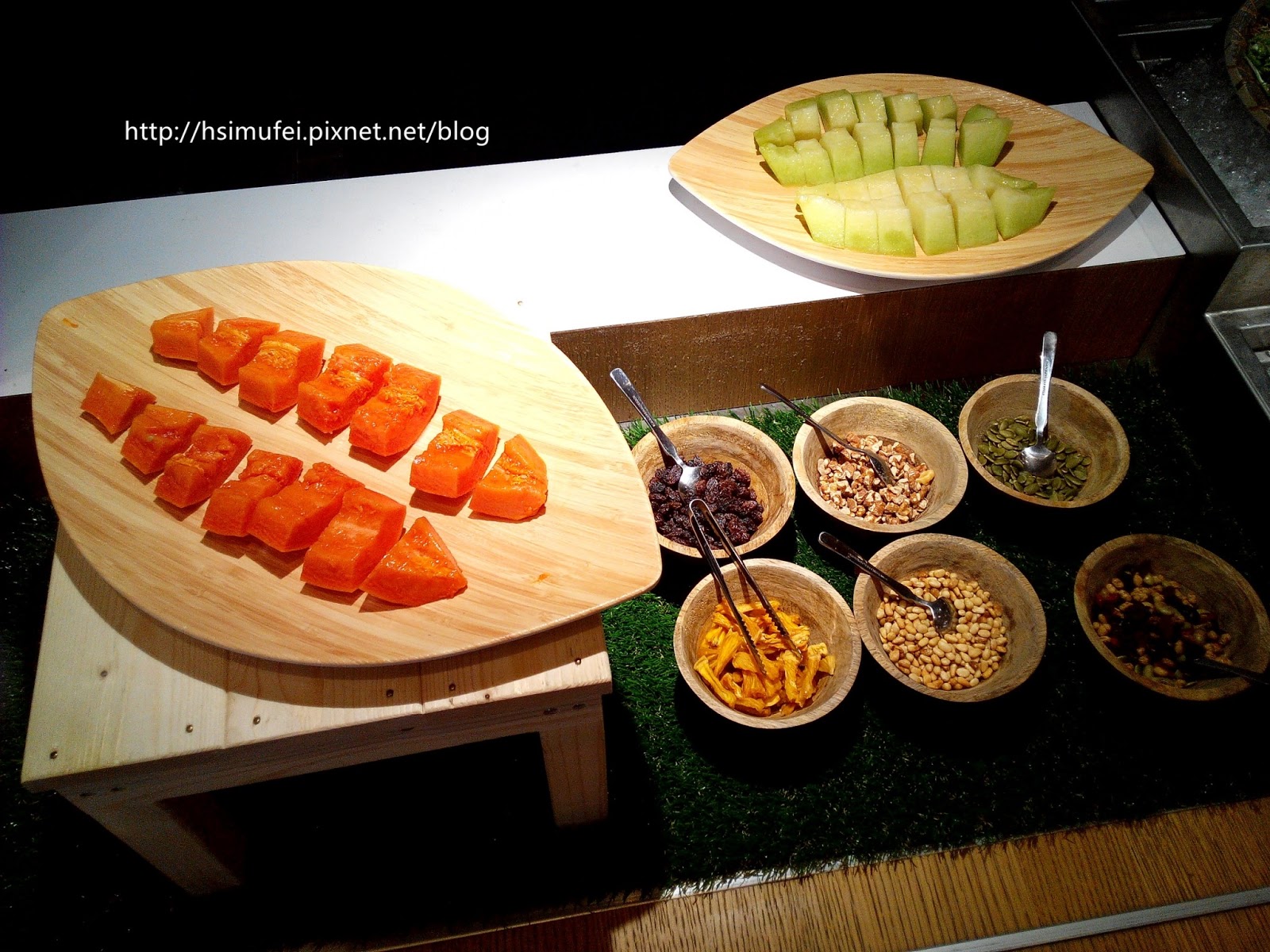 當天供應的水果為木瓜和香瓜,旁邊是葡萄乾、葵花子等六種沙拉配料。