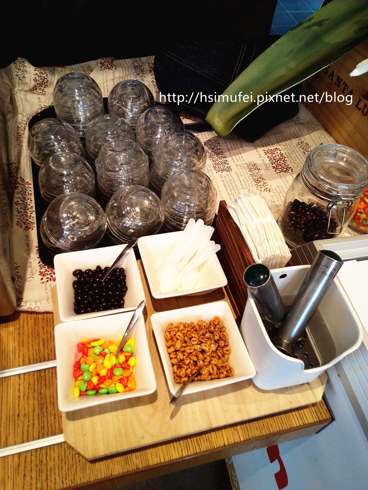 冰淇淋櫃旁有冰淇淋碗、小湯匙與三種配料。