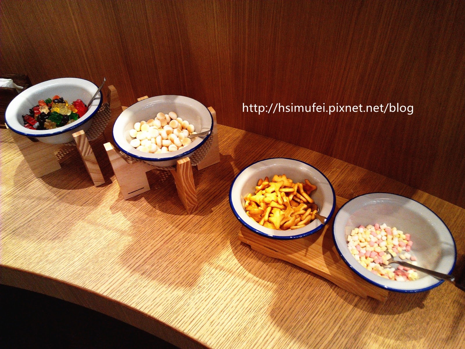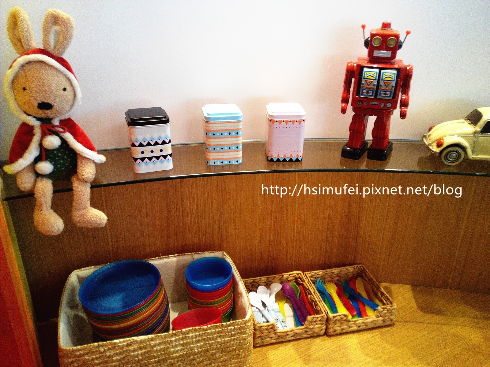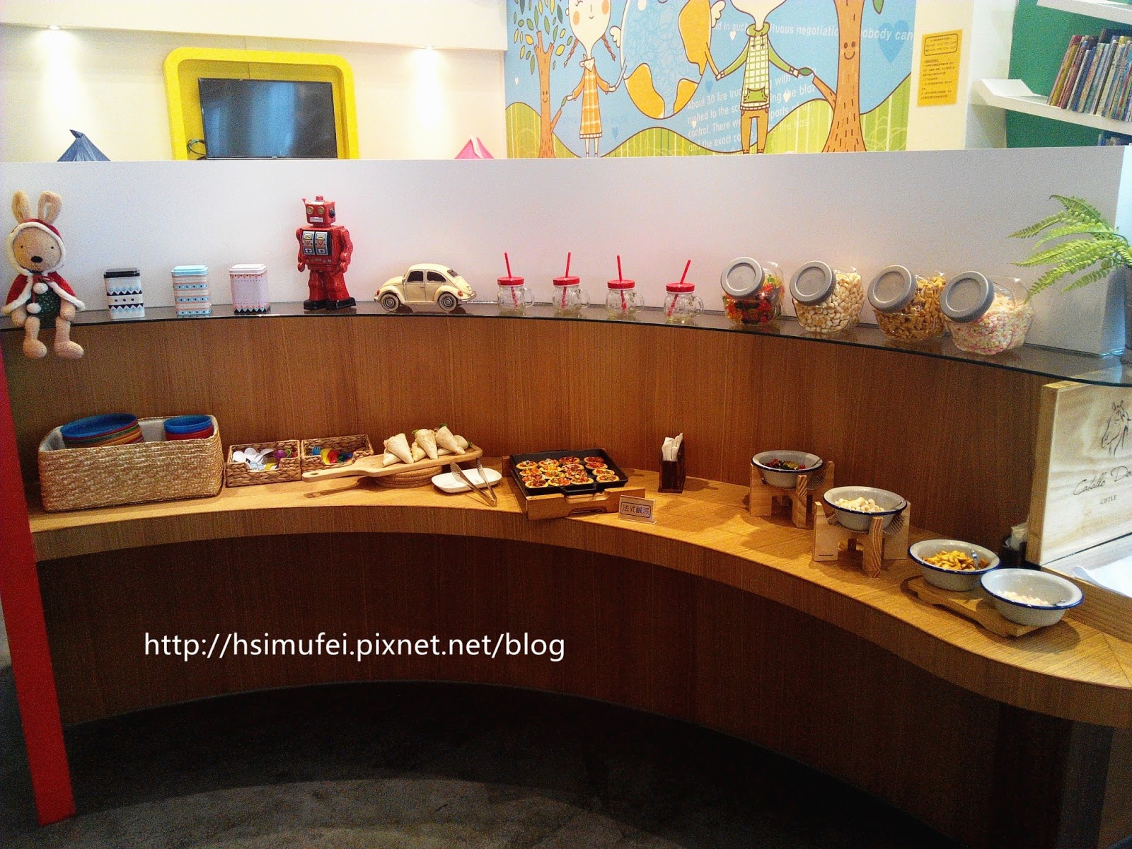 兒童遊戲區前的木櫃上置有兒童餐具以及若干餐點,右側有小熊軟糖、小饅頭、飛機餅乾及小棉花糖等兒童零食。