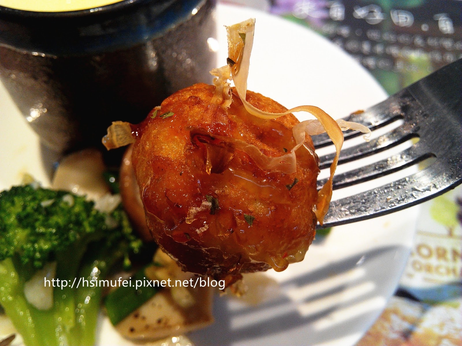 渾圓的章魚燒外皮有些許美乃滋、香料與柴魚片,軟綿微潤的內餡則裹有Q 彈鮮甜的章魚丁喔!