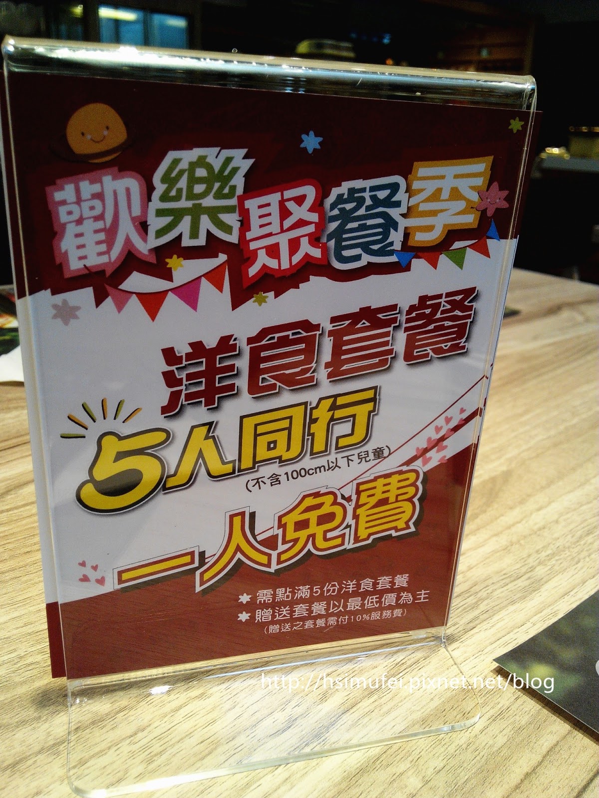 桌上立牌的兩面分別是「套餐加點飲料折價」以及「五人同行一人免費」的優惠說明。