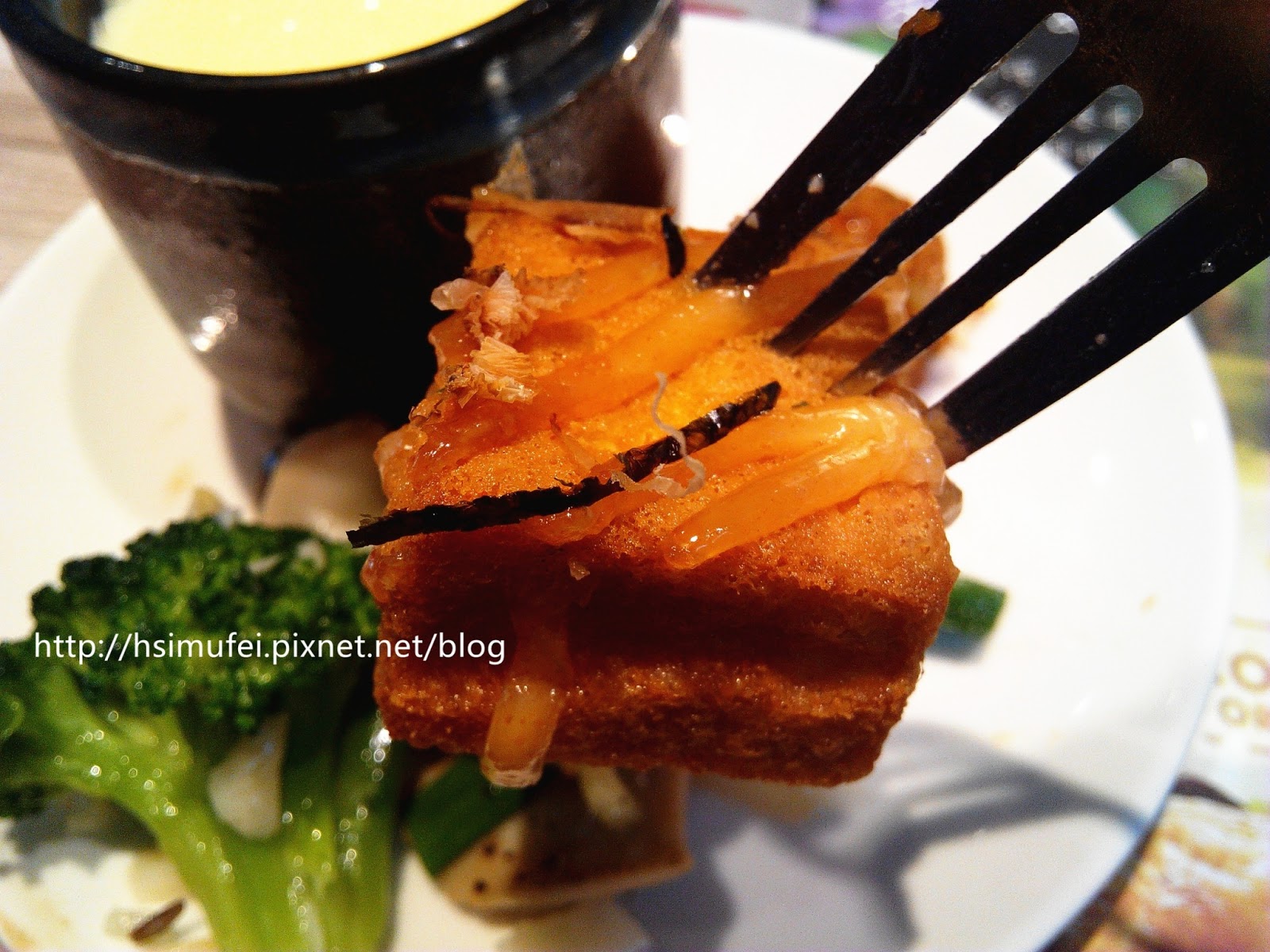 炸豆腐的亮點在其外酥內嫩的口感,不過本身滋味較平淡,上頭的海苔絲與特製美奶滋增添了其風味。