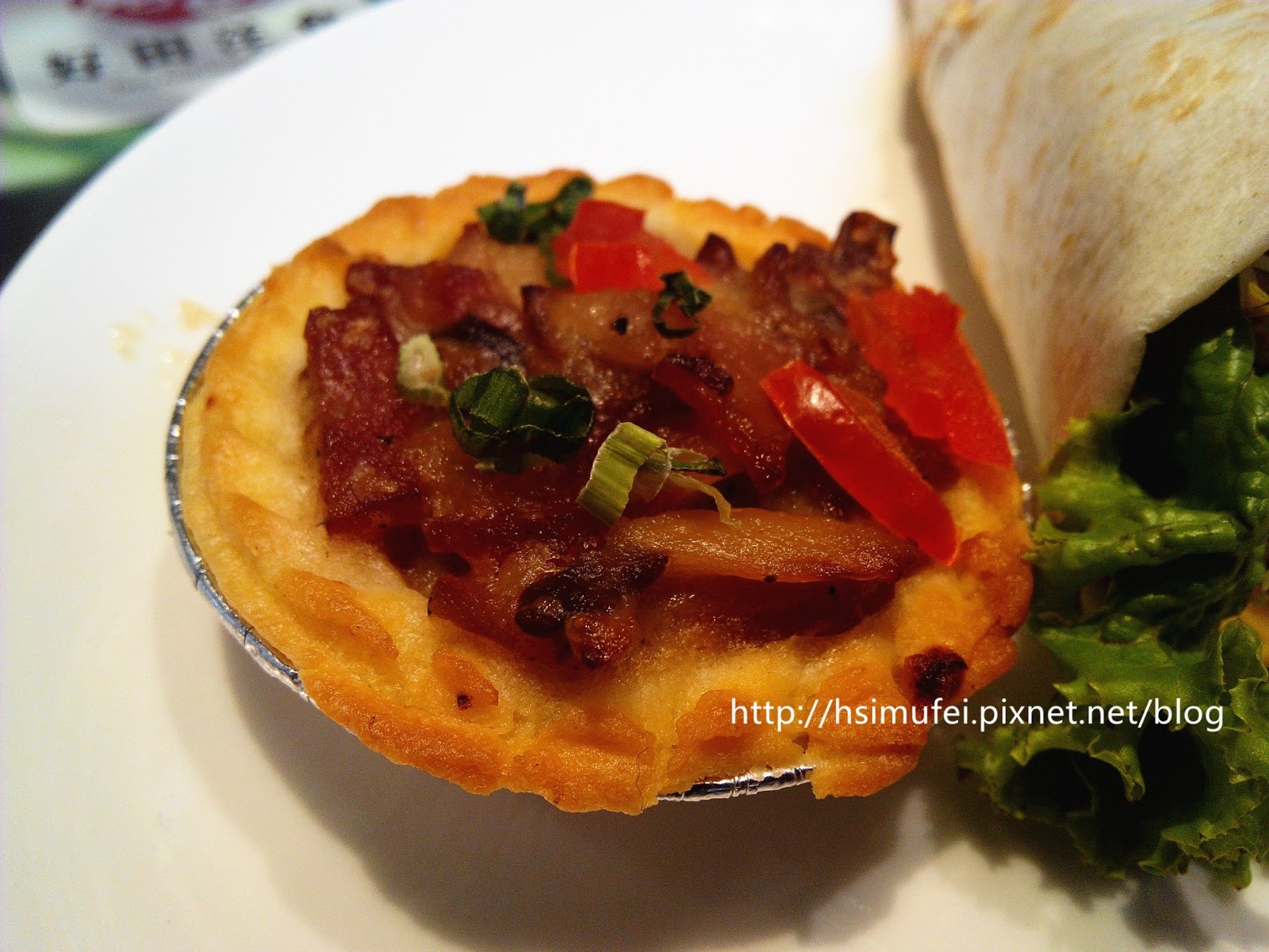 其中一款鹹派餡料為培根、甜椒與青蔥末,與底下的塔皮滋味構築出交錯的甜鹹味。