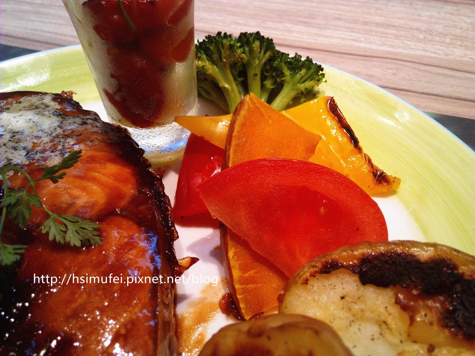 以紅酒調製成的醬汁,帶著微微酒香與甘甜味,為本身就帶有鹹度的鮭魚排帶來味覺的中和效果。軟嫩的魚肉潤而不膩,吃起來很順口,但裡面有些許魚刺,享用時須稍加注意。