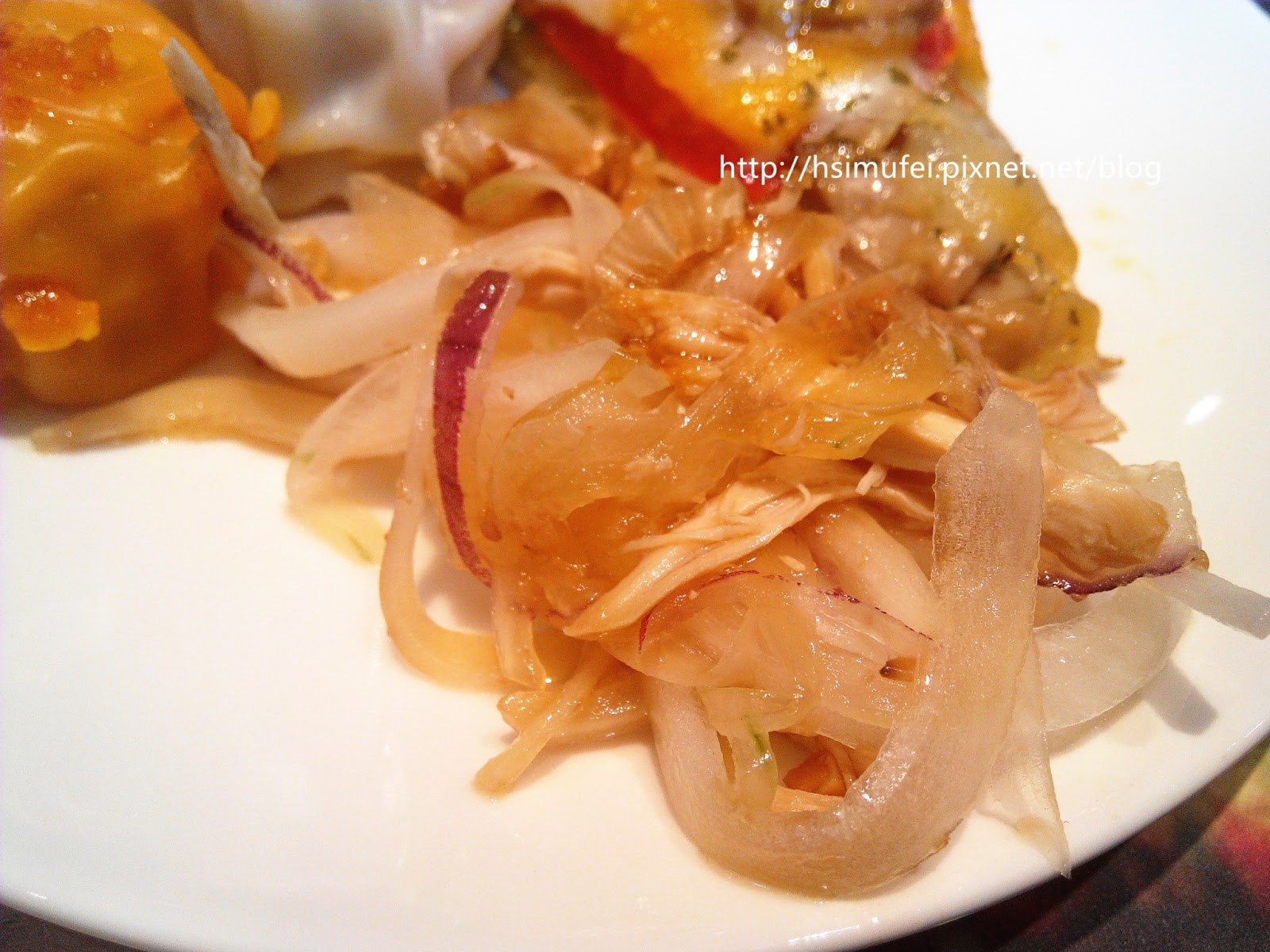 和風洋蔥有一般洋蔥與紫洋蔥絲,間或參雜了雞肉絲在裡頭,酸甜開胃。