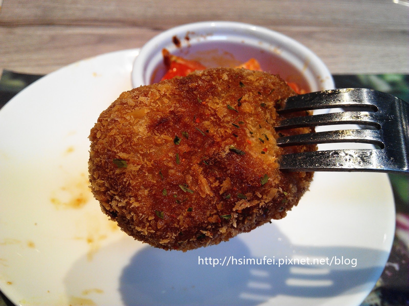 這款炸物是咖哩可樂餅,內餡為以咖哩調味的馬鈴薯泥,屬於較細緻口感。