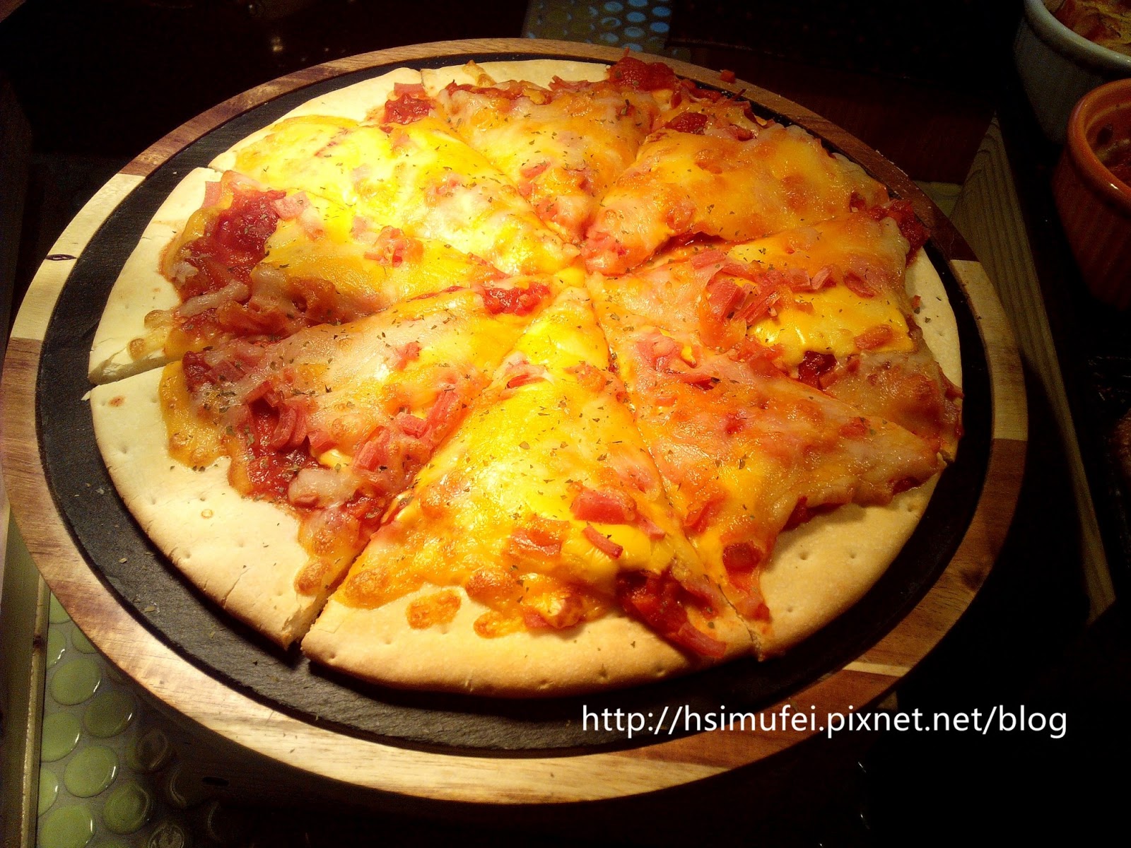 披薩鋪用的起司比例頗重,其中參雜了番茄丁;餅皮很特別,外觀近似傳統口糧,略厚而有嚼勁。