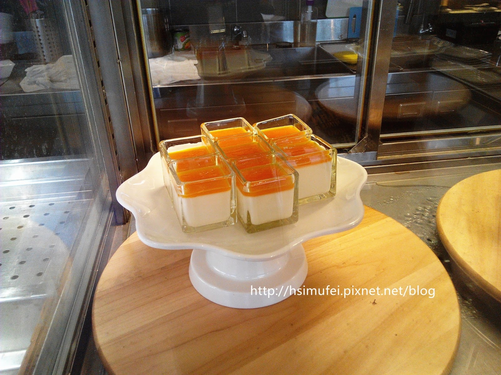 甜點冰櫃裡的四款甜點分別是焦糖布丁、芒果奶酪、紅豆大福、藍莓塔。