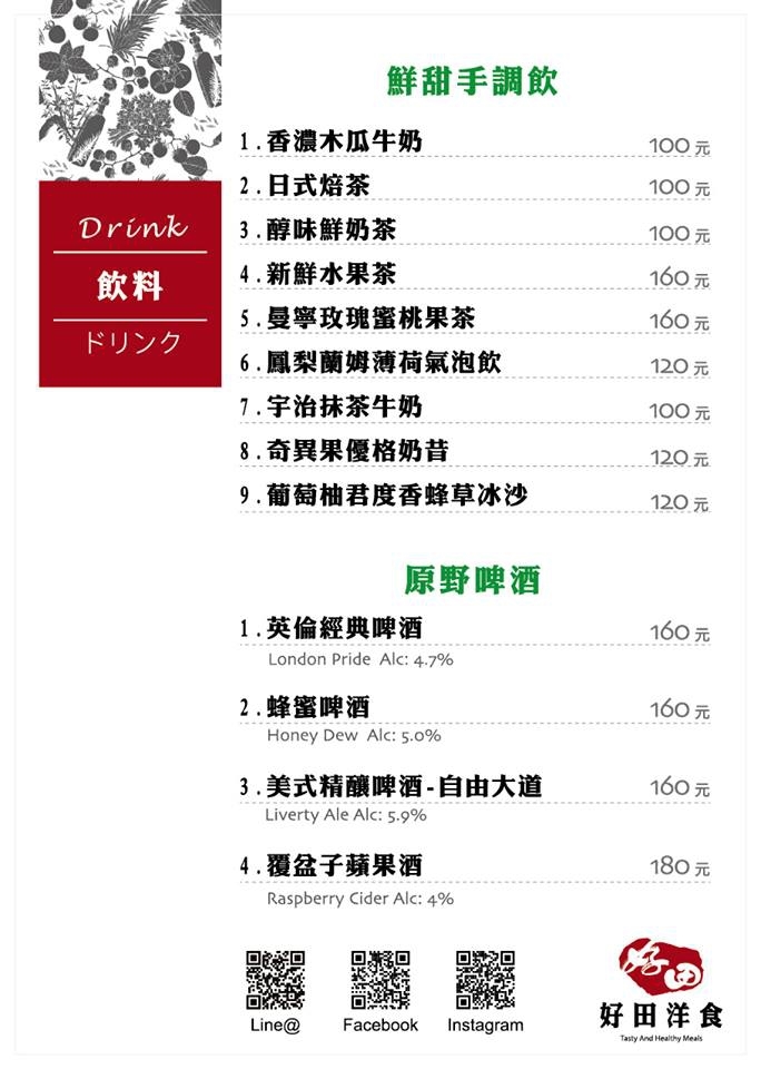 飲料部分可另外單點鮮甜手調飲與各口味的原野啤酒,現有點購套餐加點這兩類品項可折60元之優惠。