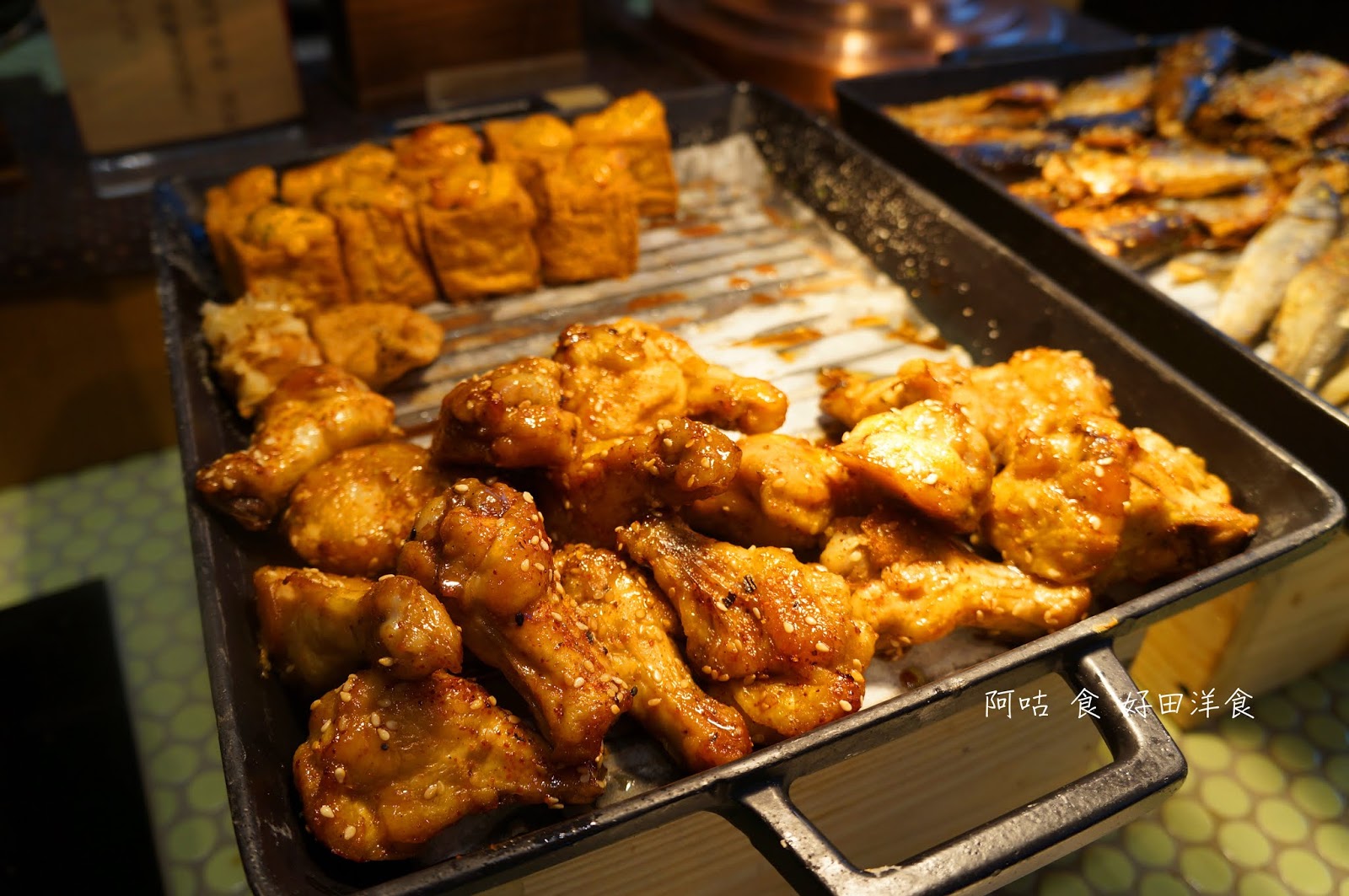 燒烤炸物類的品項時常推陳出新,當天有章魚燒、炸雞翅、炸棒棒腿、烤甜不辣、炸豆腐、烤香魚、烤秋刀魚、炸雞塊、烤黑輪等,只要食材被取用完,店家很快就加以補充,偶爾走過來繞一下常有發現新大陸般的驚喜感。