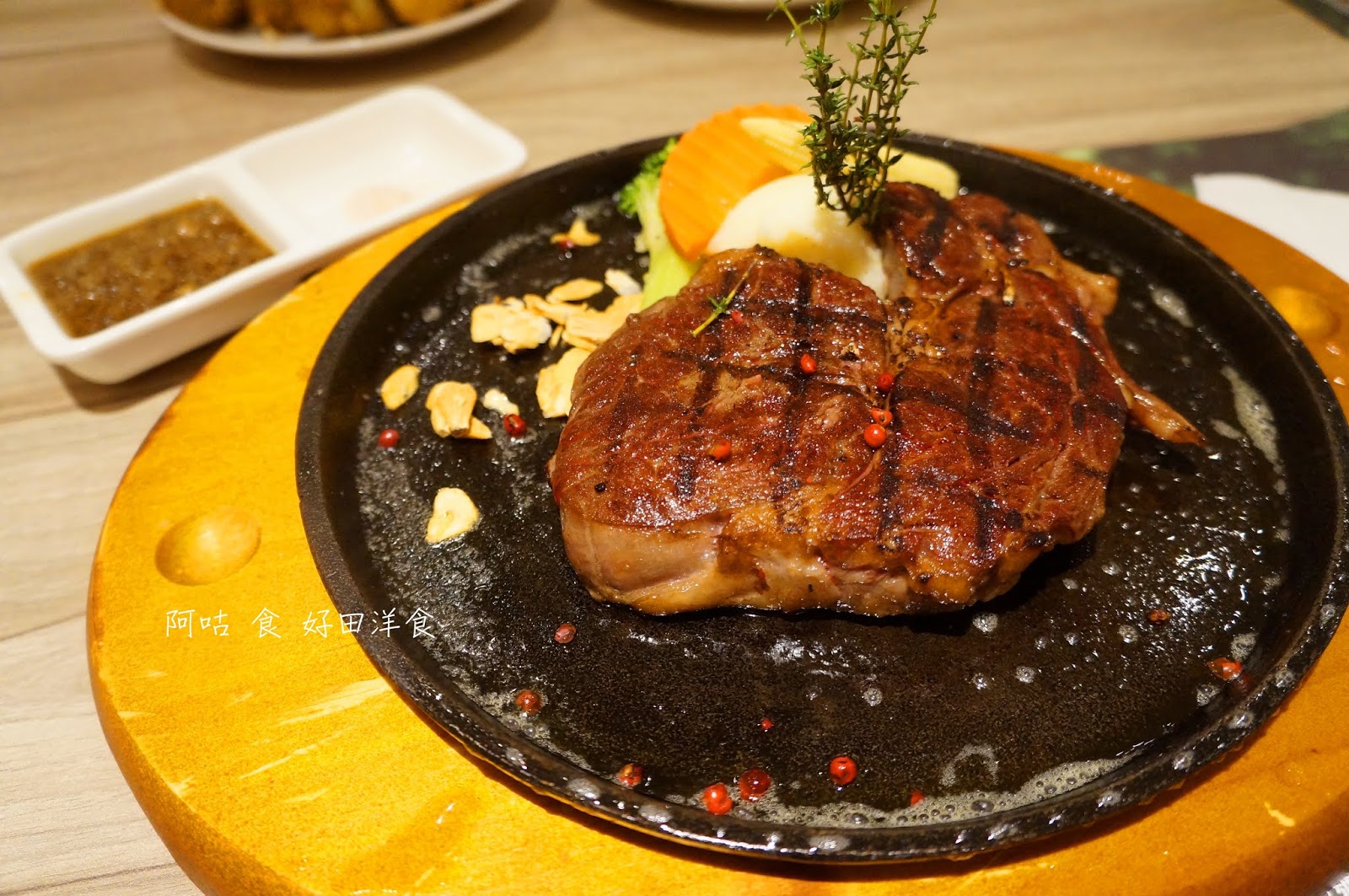 上桌時仍冒著縷縷白煙,炙烤香氣陣陣撲鼻,牛排布著鮮明的烙紋,並以馬鈴薯泥、紅蘿蔔片、青花菜、玉米筍以及烤蒜片作為陪襯,已帶來視覺上的享受。