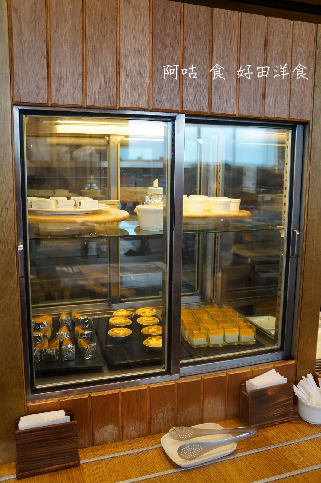 甜點冰櫃裡供有五種甜點,分別是手工布丁、草莓與芋頭大福、百香奶酪、蛋塔與手工蛋糕。