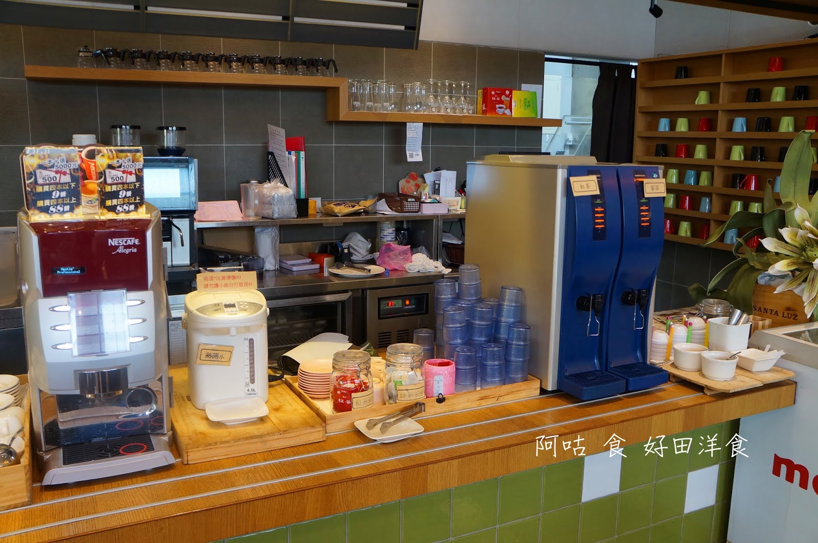 飲料區有咖啡機、茶包、紅茶、麥茶等,冷、熱飲兼具。