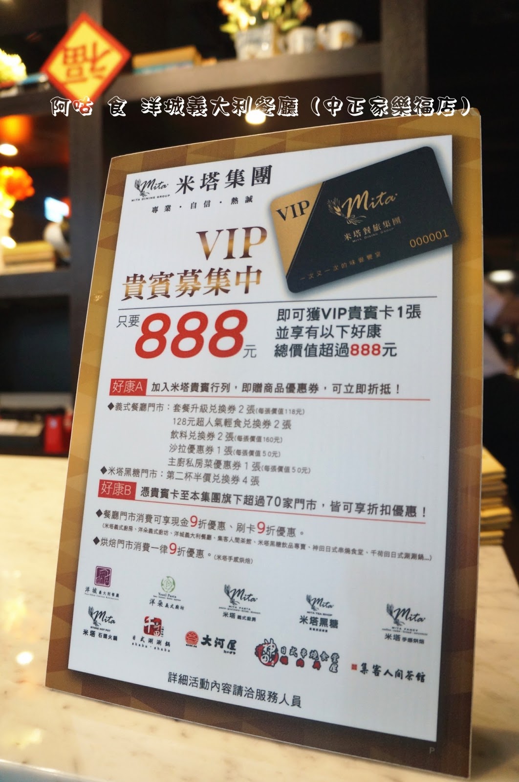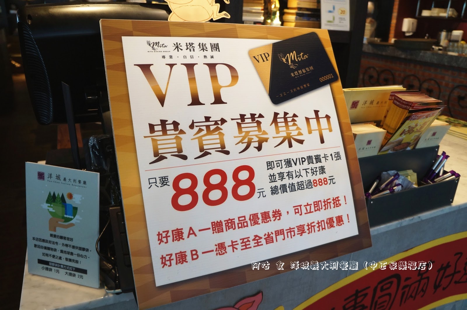 櫃檯上放置了DM、名片以及米塔集團 VIP卡獲取與優惠資訊立牌。