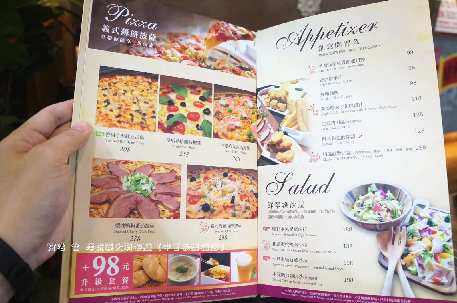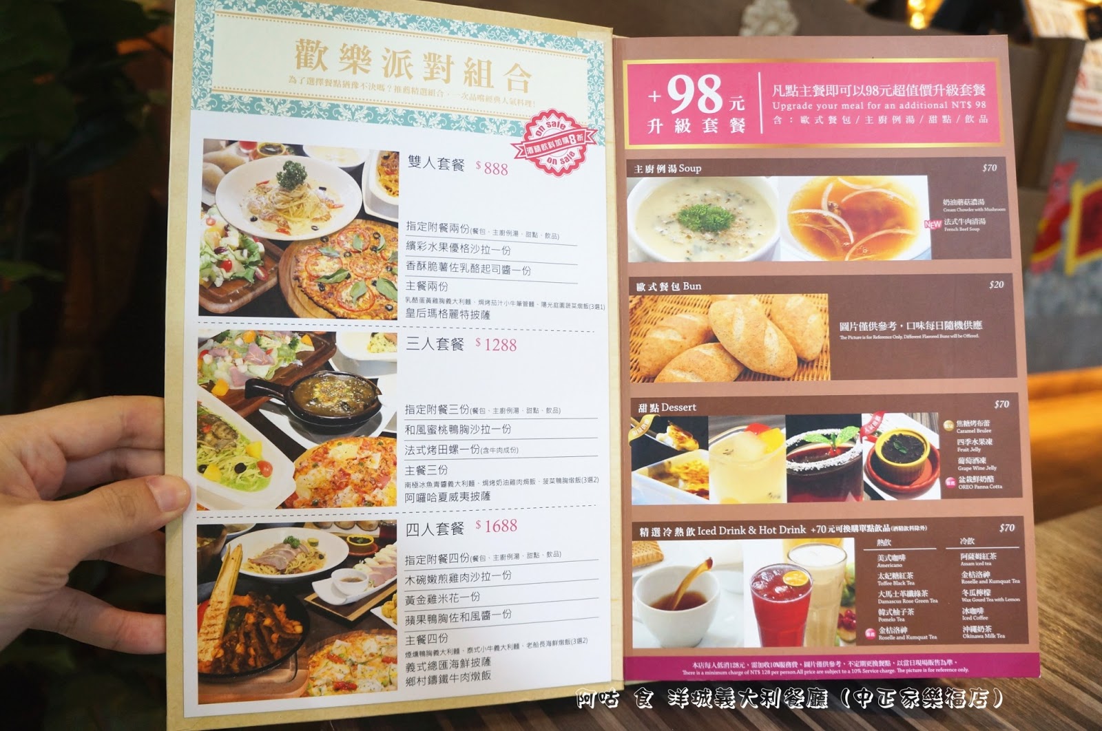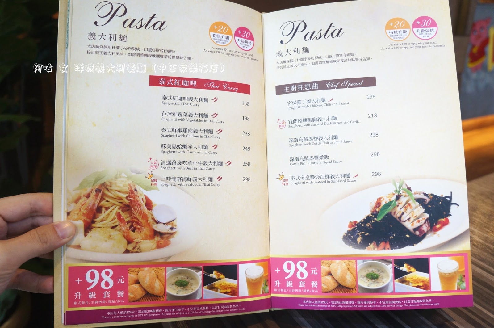 洋城主打餐點有多種口味義大利麵、燉飯、披薩,價位落在 128到 308元之間,皆可以98元升級為有歐式麵包、主廚例湯、甜點與附餐飲料的套餐,個人覺得升級套餐頗超值。