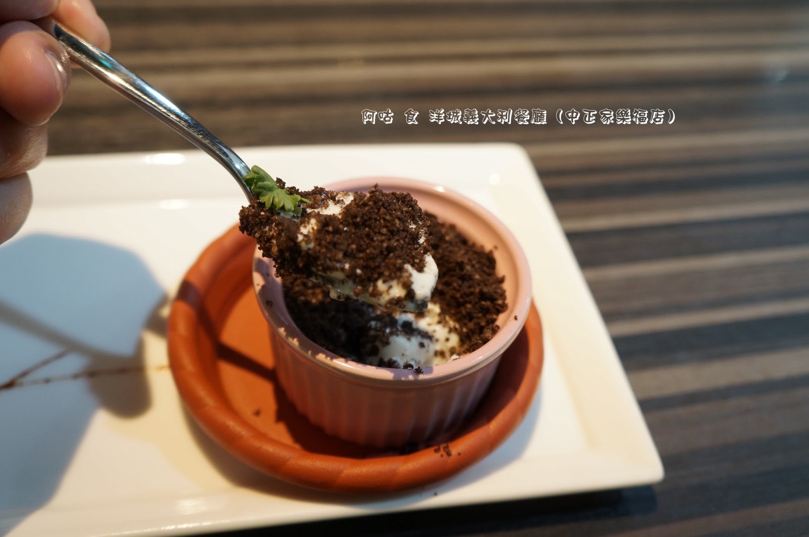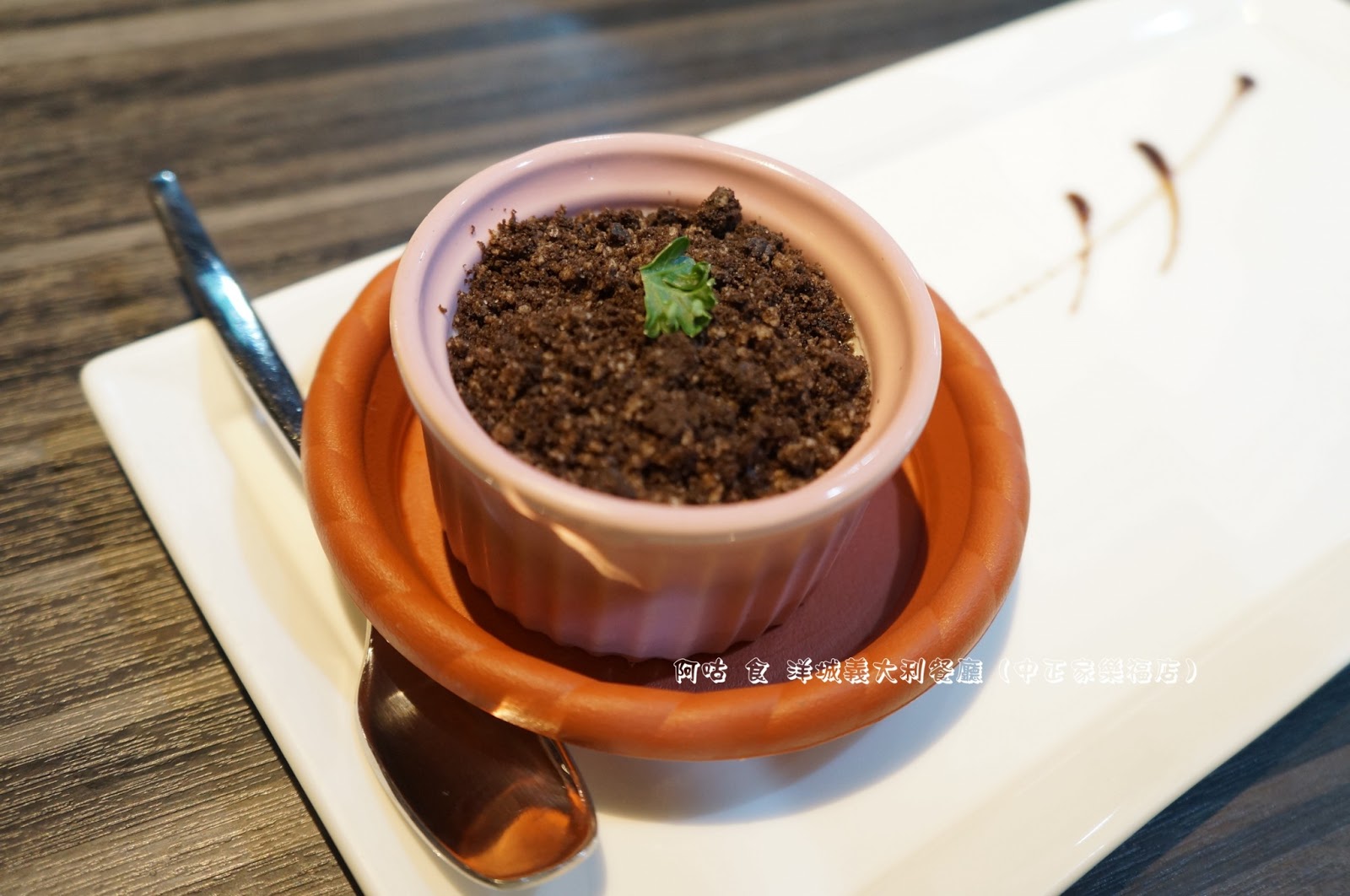 造型可愛,用來仿擬泥土的巧克力顆粒中放上一枚可食用嫩葉。底下的奶酪口感滑嫩,甜而不膩。
