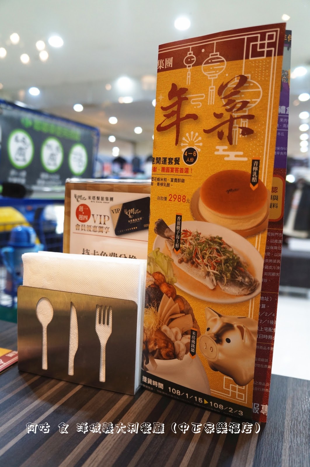 每張桌面上皆放有檸檬水、調味料、餐巾紙、年菜DM、 VIP優惠資訊立牌以及對應人數的餐具、MENU。