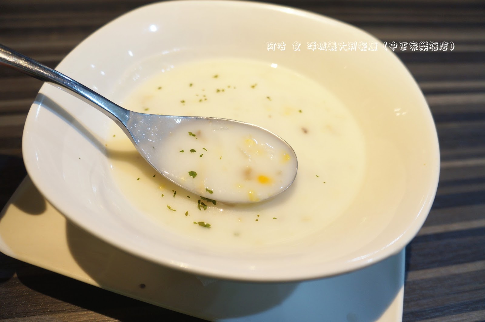 湯裡加了蘑菇與玉米,並撒上適量義式香料增添風味,喝起來口感滑順而厚實,奶香馥郁。