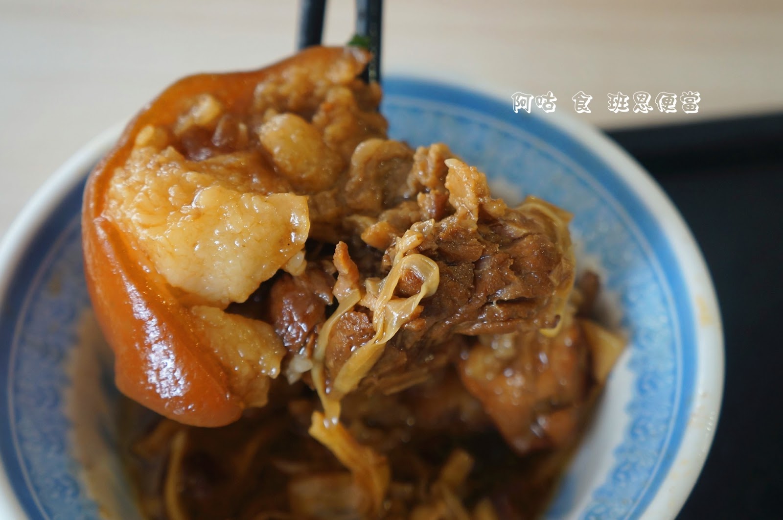油亮爌肉中間以竹籤固定,肥瘦比例各半,既能享受肥肉的軟滑 Q彈,又能品嘗瘦肉的紮實口感,而且滷得十分入味,香氣撲鼻,滋味鹹中帶甜,非常下飯。