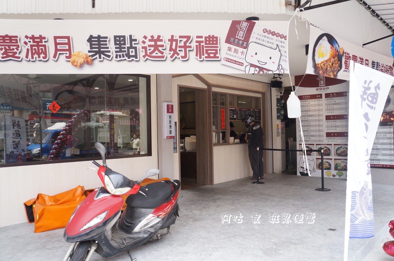「班恩」一詞即為閩南語的「飯」,騎樓掛著滿月集點送好禮的活動布條。