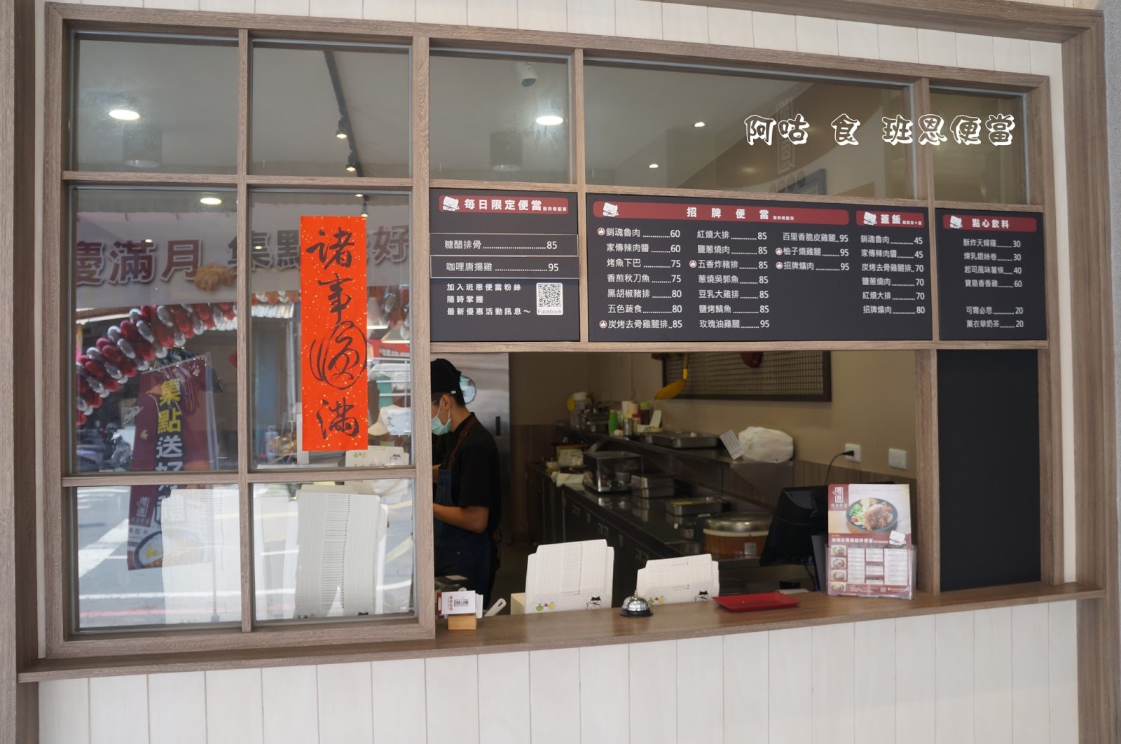 櫃檯上方亦有餐點價目表,提供的品項為招牌便當、蓋飯、每日限定便當、點心與飲料,主餐價位落在45到 120元之間。