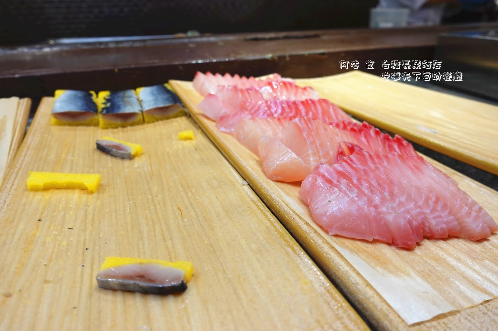 刺身區提供鮭魚、旗魚、海鱺魚、黃金魚蛋、鯛魚、水針魚六種,未見昔日的鮪魚,不知是否為平日前往之故。