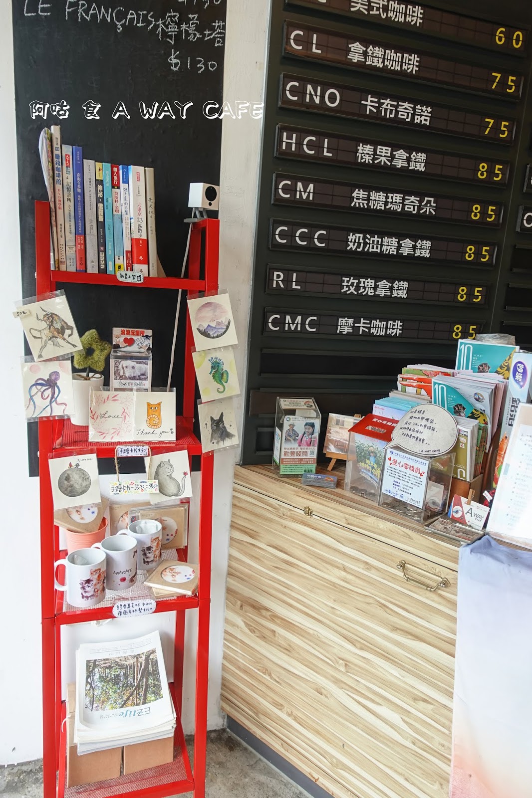 櫃檯旁鐵架置放供客人閱覽的書籍,並販售手繪卡片、馬克杯、杯墊等產品。