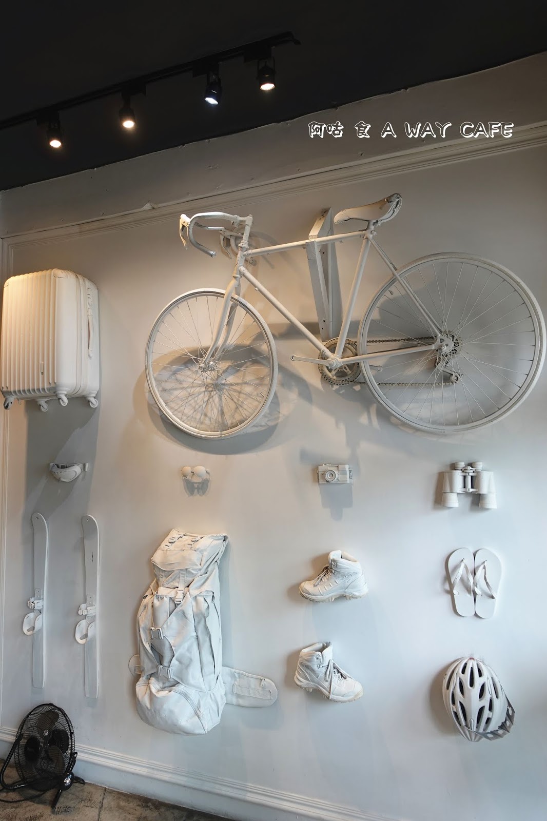 店裡空間不大,牆面略顯斑駁,布置頗有特色,其中一面牆掛著塗上白漆的行李箱、腳踏車、滑雪板、相機、望遠鏡等旅行用品作擺飾。