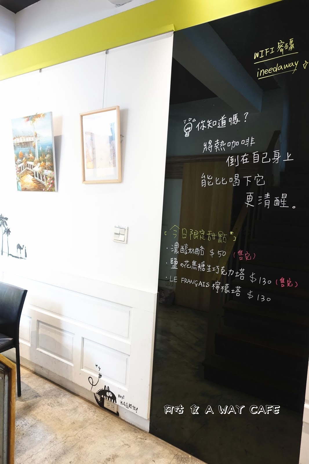 樓梯旁黑板標示WIFI密碼、當日限定甜點品項與價位,以及逗趣的文字。