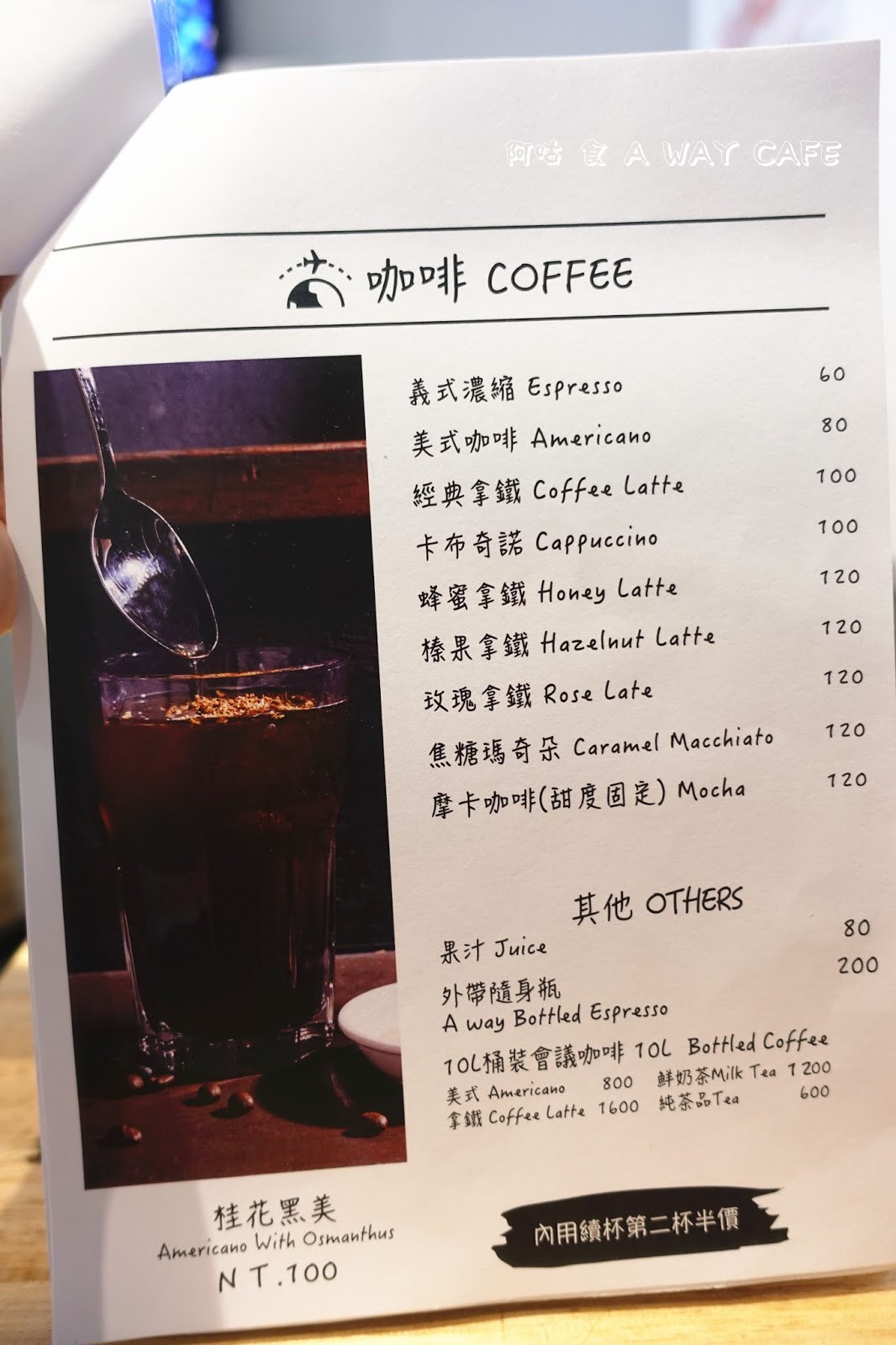 飲品部分有茶飲、奶品、咖啡、果汁、特調咖啡等,價位落在80到 150 元區間,內用續用第二杯可享半價優惠。